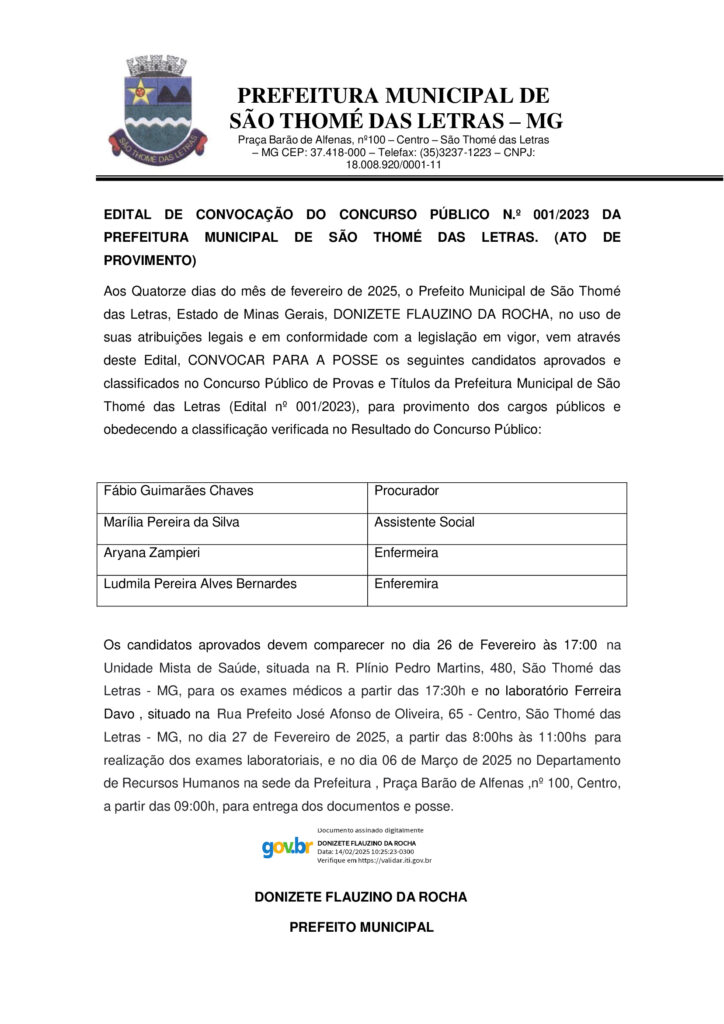 Aos quatorze dias do mês de Fevereiro de 2025, o Prefeito Municipal de São Thomé das Letras, Estado de Minas Gerais, Donizete Flauzino Da Rocha, no uso de suas atribuições legais e em conformidade com a legislação em vigor, vem através deste Edital, CONVOCAR PARA A POSSE os seguintes candidatosaprovados e classificados no Concurso Público da Prefeitura Municipal de São Thomé das Letras (Editail nº 001/2023), para provimento dos cargos públicos e obedecendo a classificação verificada no Resultado do Concurso Público: (anexo abaixo)