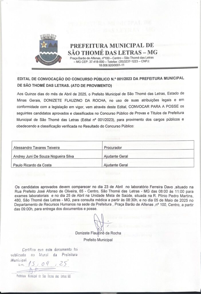 Aos quinze dias do mês de Abril de 2025, o Prefeito Municipal de São Thomé das Letras, Estado de Minas Gerais, Donizete Flauzino Da Rocha, no uso de suas atribuições legais e em conformidade com a legislação em vigor, vem através deste Edital, CONVOCAR PARA A POSSE os seguintes candidatos aprovados e classificados no Concurso Público da Prefeitura Municipal de São Thomé das Letras (Edital nº 001/2023), para provimento dos cargos públicos e obedecendo a classificação verificada no Resultado do Concurso Público: (anexo abaixo)