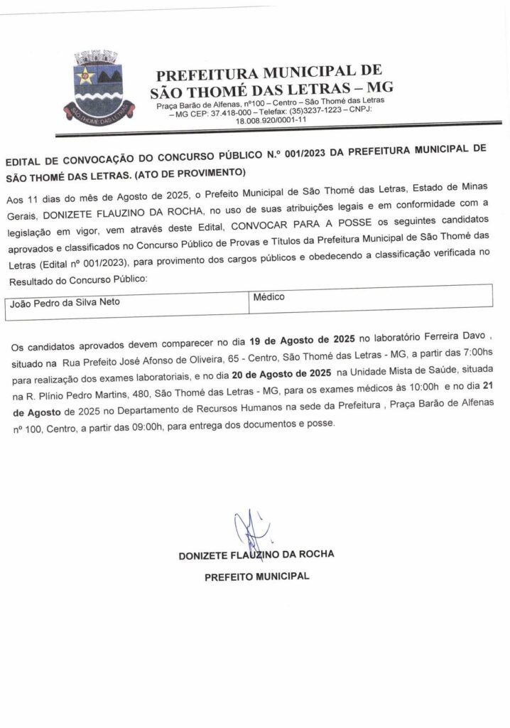 O Prefeito Municipal de São Thomé das Letras, Mg, Donizete Flauzino Da Rocha, no uso de suas atribuições legais e em conformidade com a legislação em vigor, vem através deste Edital, CONVOCAR PARA A POSSE os seguintes candidatos aprovados e classificados no Concurso Público da Prefeitura Municipal de São Thomé das Letras (Edital nº 001/2023), para provimento dos cargos públicos e obedecendo a classificação verificada no Resultado do Concurso Público: (anexo abaixo)