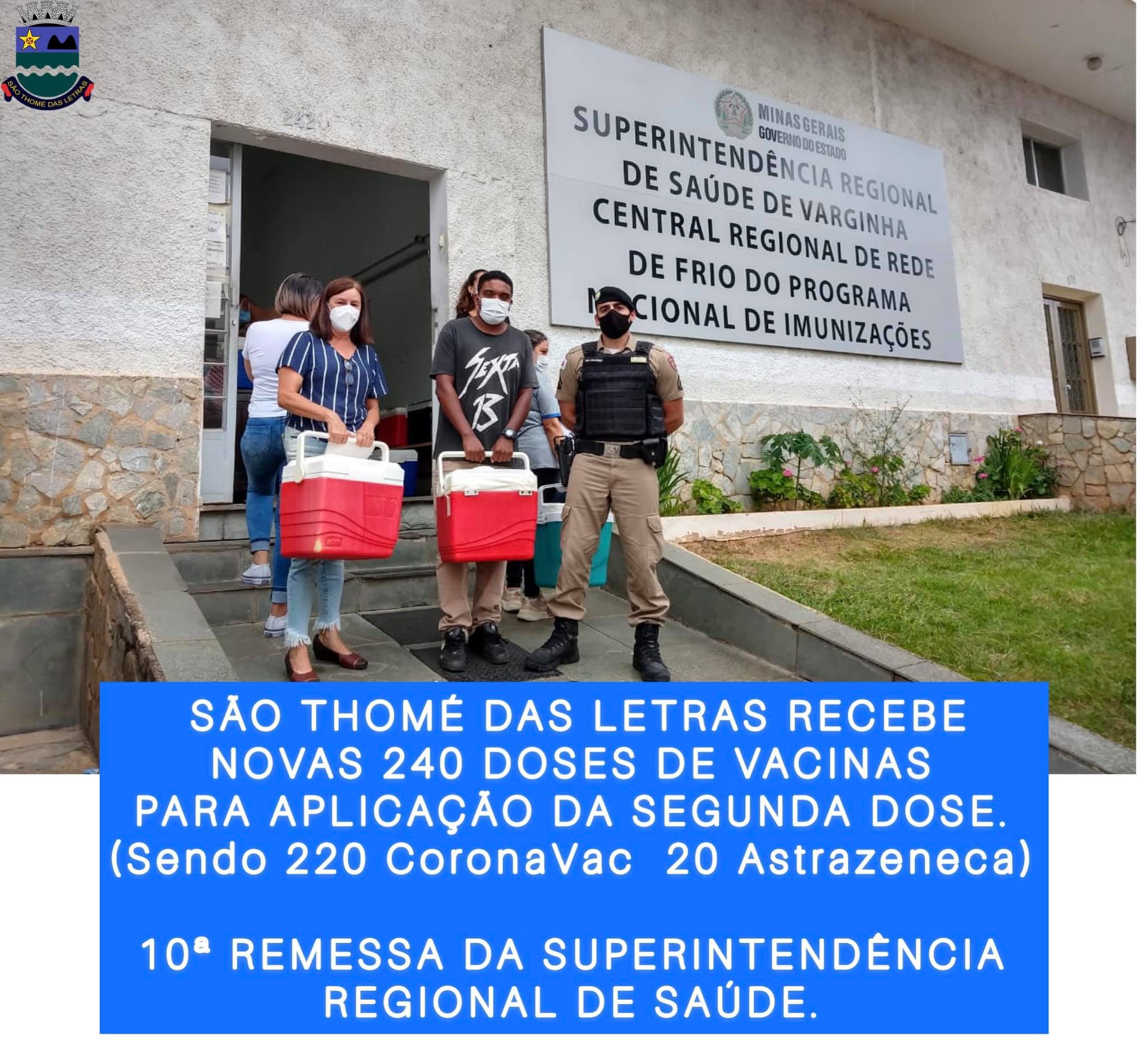 O Departamento Municipal de Saúde recebeu na Superintendência Regional de Saúde em Varginha, a 10ª remessa de distribuição; foram entregues 220 doses da Coronavac e 20 da Astrazeneca, vacinas contra a covid-19. Os idosos das faixas etárias contempladas serão informados, divulgaremos na página e através do carro de som, assim que estiver no prazo certo das aplicações da segunda dose.