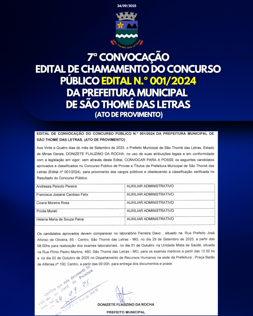 7ª SÉTIMA CONVOCAÇÃO DO CONCURSO PÚBLICO EDITAL 001/2024 DA PREFEITURA DE SÃO THOMÉ DAS LETRAS