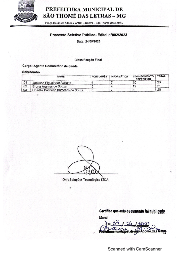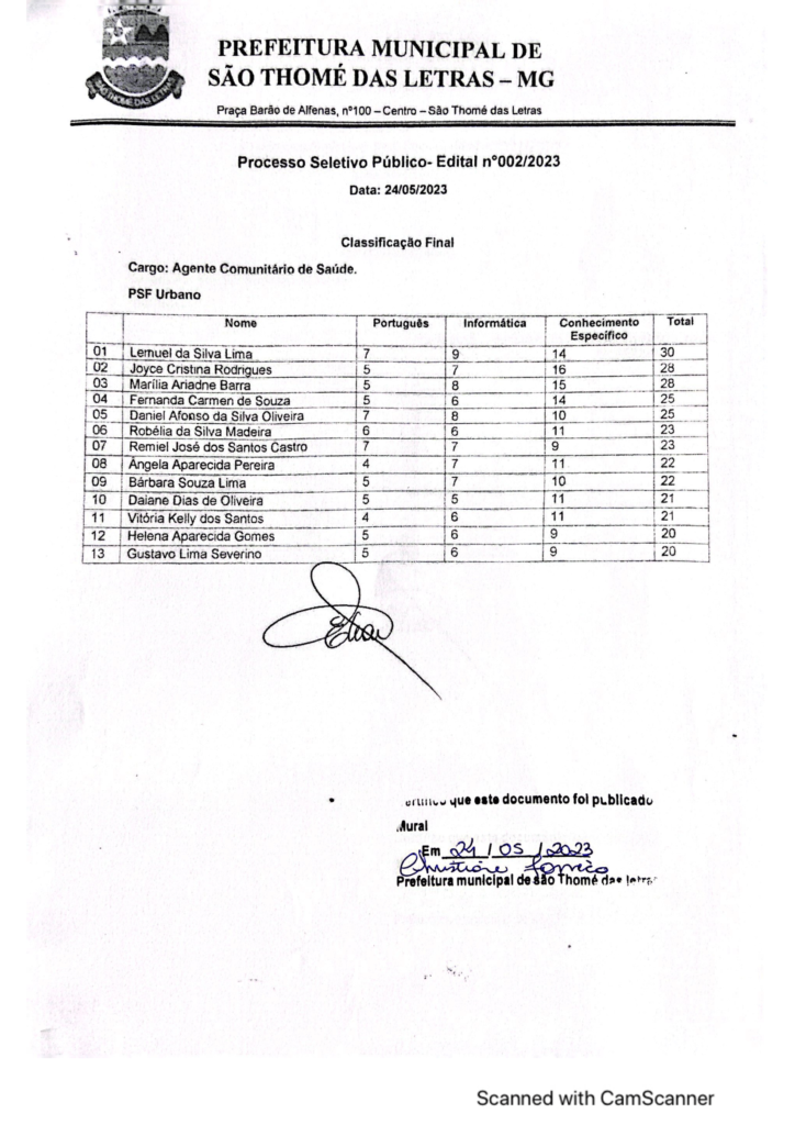 CLASSIFICAÇÃO FINAL PROCESSO SELETIVO 002/2023 AGENTE COMUNITÁRIO DE SAÚDE