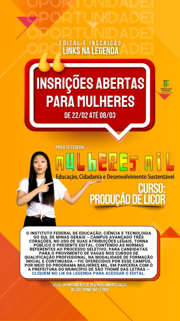 ABERTAS INSCRIÇÕES PARA MULHERES SE QUALIFICAREM NA PRODUÇÃO DE LICOR – INSTITUTO FEDERAL DO SUL DE MINAS EM PARCERIA COM A PREFEITURA MUNICIPAL Início / Notícia / CLIQUE AQUI E ACESSE O EDITALBaixar