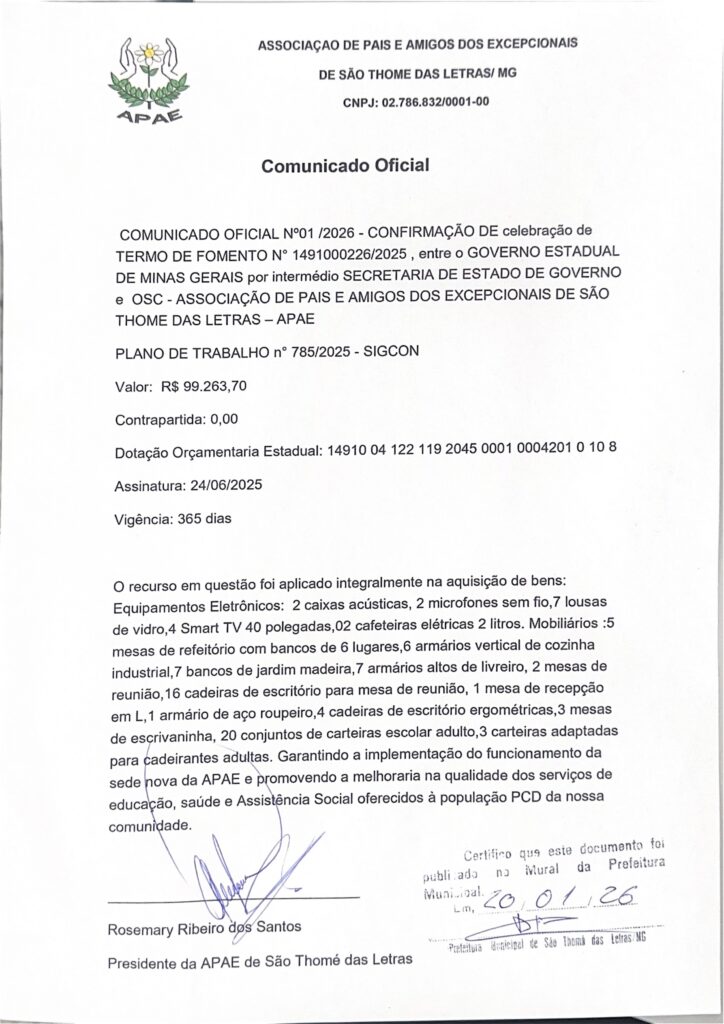 APAE SÃO TOMÉ: COMUNICADO OFICIAL 01/2026 CONFIRMAÇÃO DE CELEBRAÇÃO DE TERMO DE FOMENTO 1491000226/2025 ENTRE GOVERNO ESTADUAL DE MINAS GERAIS POR INTERMÉDIO DA SECRETARIA DE ESTADO DE GOVERNO E OSC – ASSOCIÇÃO DE PAIS E AMIGOS DOS EXCEPCIONAIS DE SÃO THOMÉ DAS LETRAS – APAE