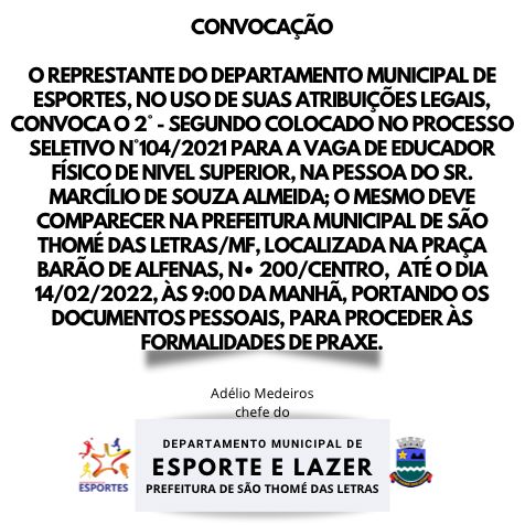 O Departamento de Assistência Social no uso de suas atribuições convoca a segunda colocada no processo seletivo publico nº001/2021 PAL nº 104/2021 para a vaga de Orientador (a) Social em Nível Superior PAULA FERNANDA DO AMARAL SANTOS, para o comparecimento no Centro de Referencia de Assistência Social -CRAS, localizada na Rua Joaquim Jose Mendes Peixoto,230 centro ,no dia 07 de Janeiro 2022 as 08:00 horas da Manhã Portando todos os documentos pessoais contidos no edital do processo seletivo para a contratação