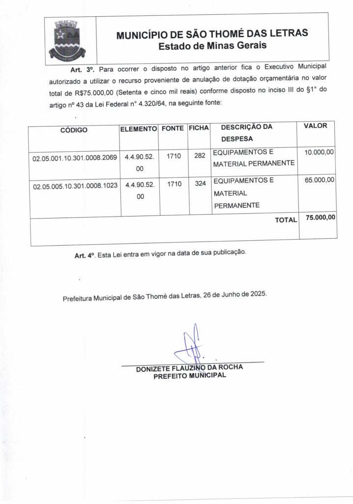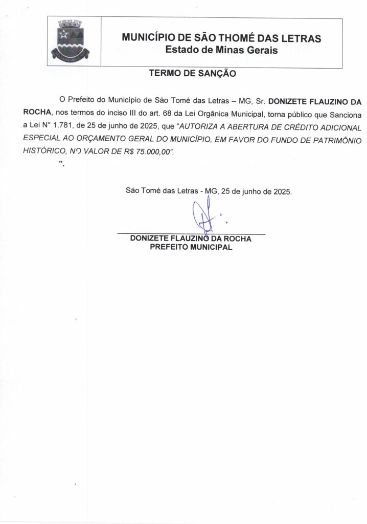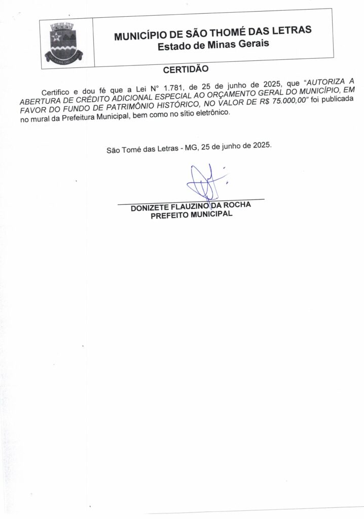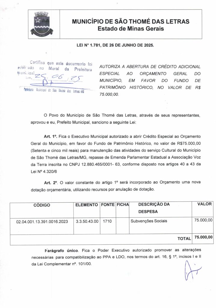 AUTORIZA A ABERTURA DE CRÉDITO ADICIONAL ESPECIAL AO ORÇAMENTO GERAL DO MUNICÍPIO EM FAVOR DO FUNDO DE PATRIMÔNIO HISTÓRICO NO VALOR DE R$75.000.00