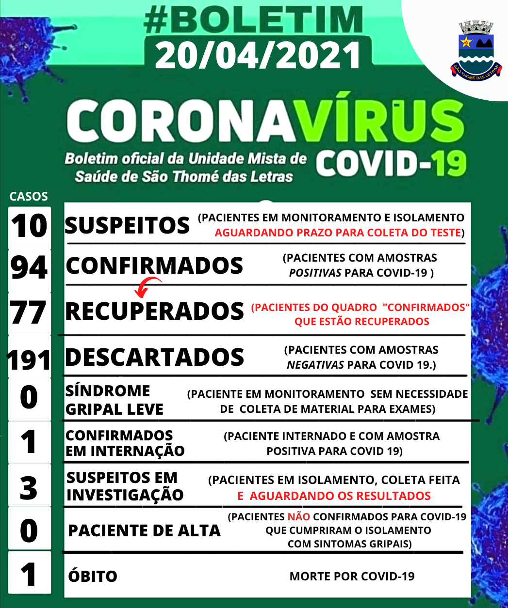 #BOLETIM| Departamento Municipal de Saúde informa: atualização em São Thomé das Letras – (TODO PROCEDIMENTO DE TESTAGEM É REALIZADO A PARTIR DO AVAL E MONITORAMENTO MÉDICO, RESPEITANDO O PROTOCOLO DO MINISTÉRIO DA SAÚDE PARA A EFETIVIDADE DO TESTE.)