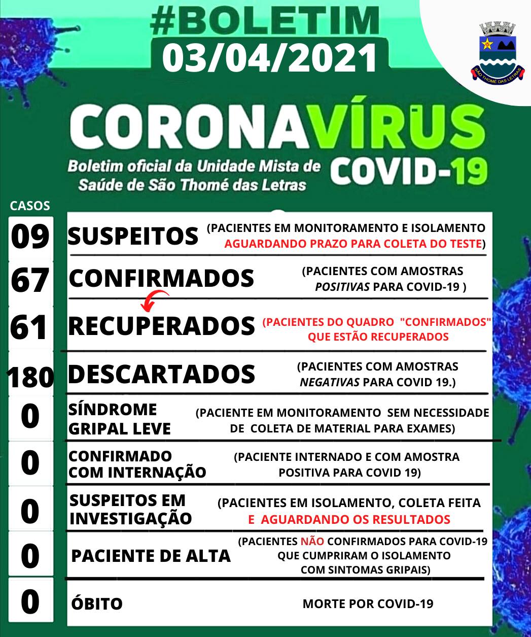 Departamento Municipal de Saúde informa: atualização em São Thomé das Letras – (TODO PROCEDIMENTO DE TESTAGEM É REALIZADO A PARTIR DO AVAL E MONITORAMENTO MÉDICO, RESPEITANDO O PROTOCOLO DO MINISTÉRIO DA SAÚDE PARA A EFETIVIDADE DO TESTE.)