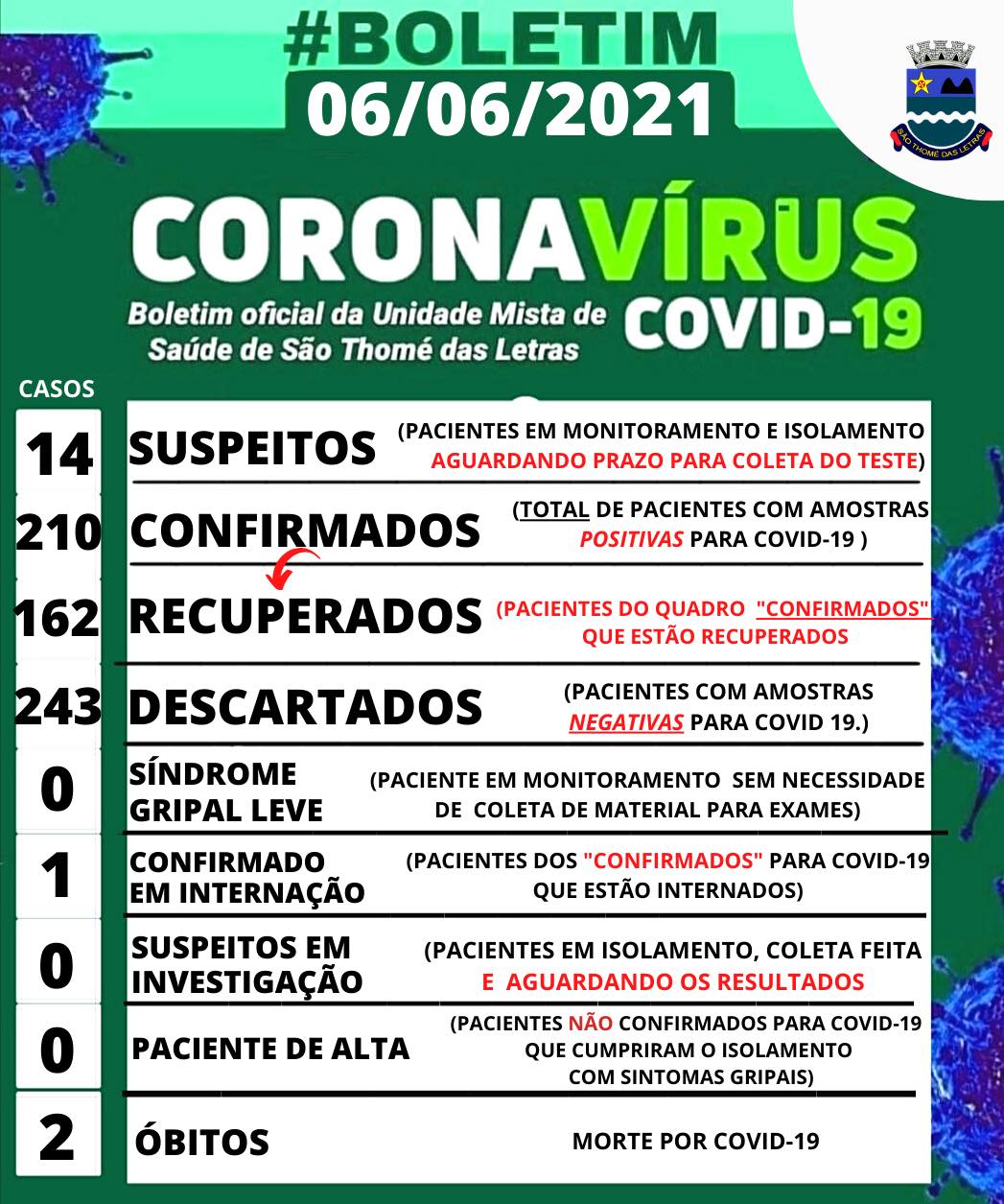 📌#BOLETIM| Departamento Municipal de Saúde informa: 210 CASOS CONFIRMADOS ATÉ HOJE, SENDO: