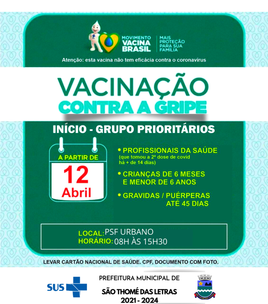 𝗩𝗔𝗖𝗜𝗡𝗔 𝗖𝗢𝗡𝗧𝗥𝗔 𝗔 𝗚𝗥𝗜𝗣𝗘 INFLUENZA- INÍCIO DA CAMPANHA NESTA SEGUNDA-FEIRA 12 DE ABRIL| Para receber a dose, procure o PSF URBANO de São Thomé das Letras, com o documento de identificação e cartão de vacina, na Rua Francisco Pinto de Souza n°50, de 8h às 15h30.
