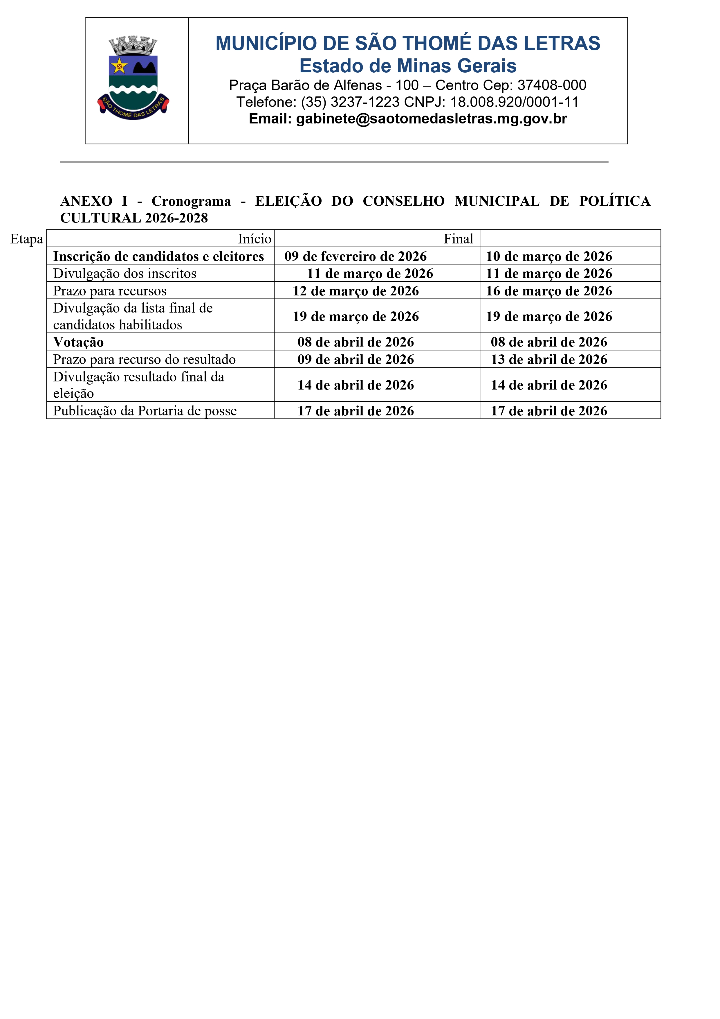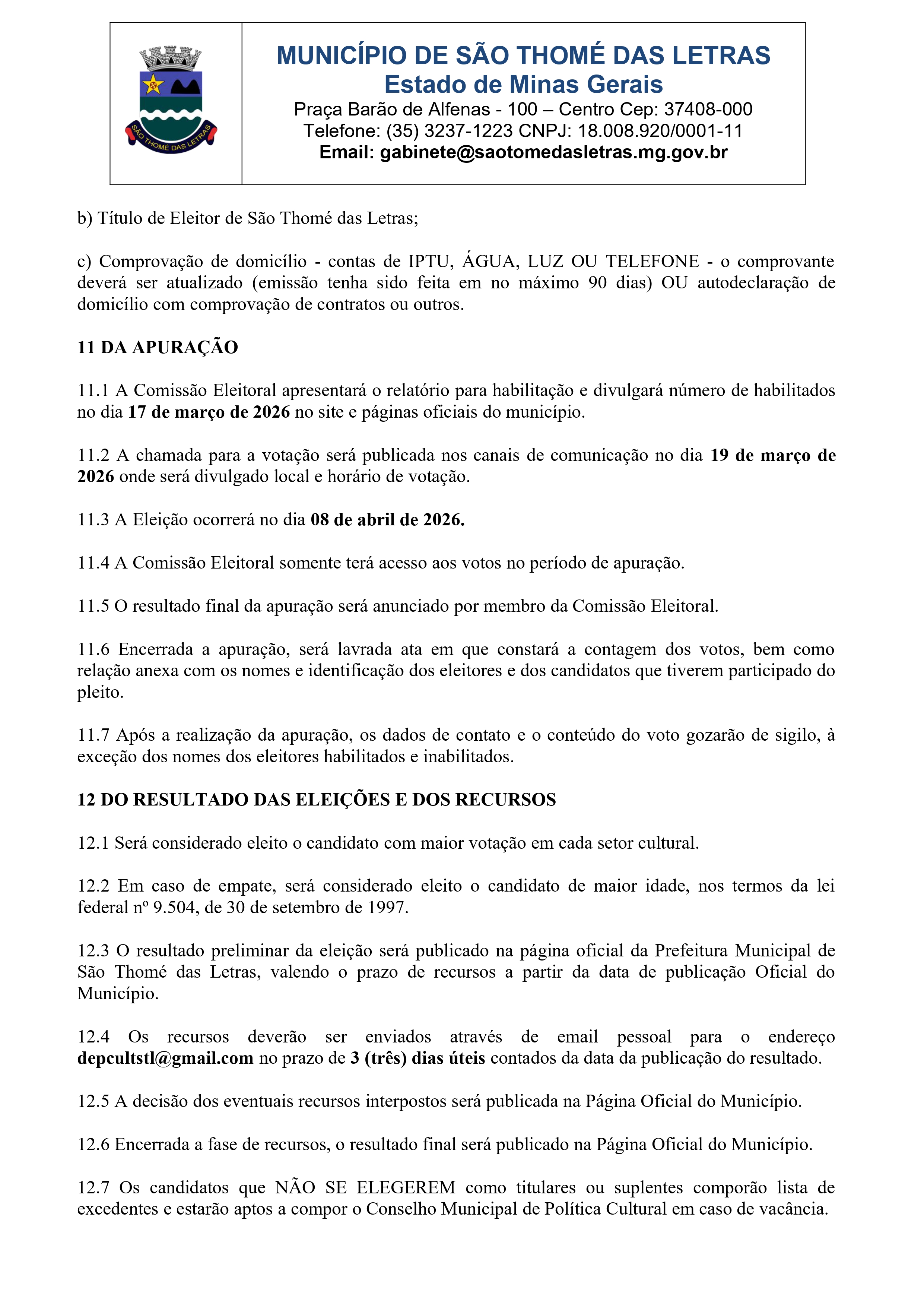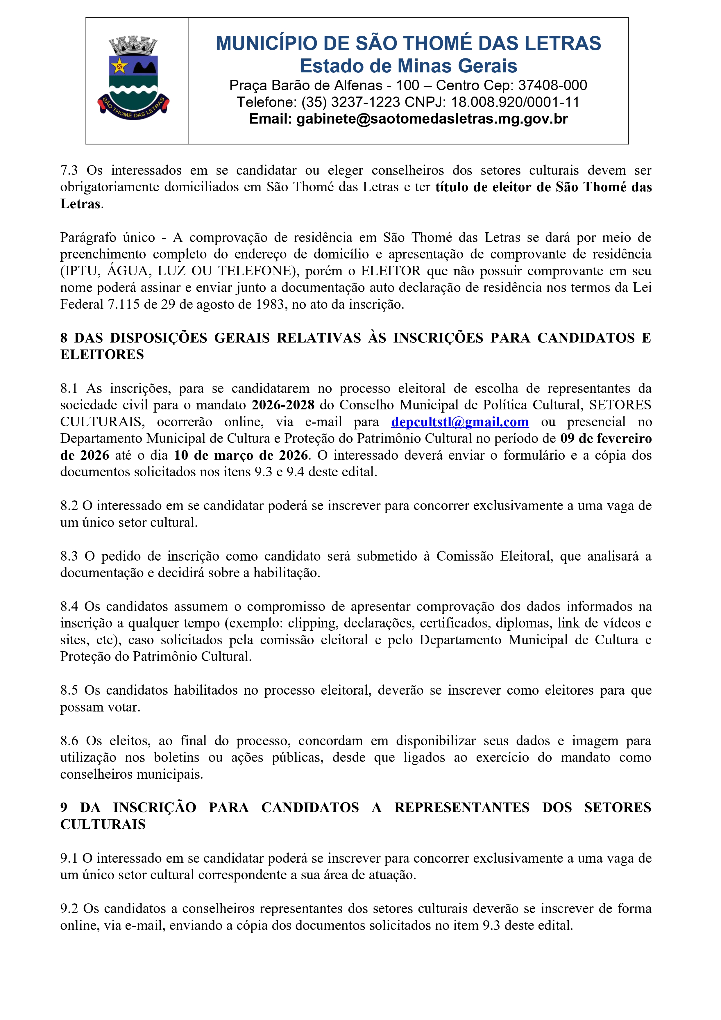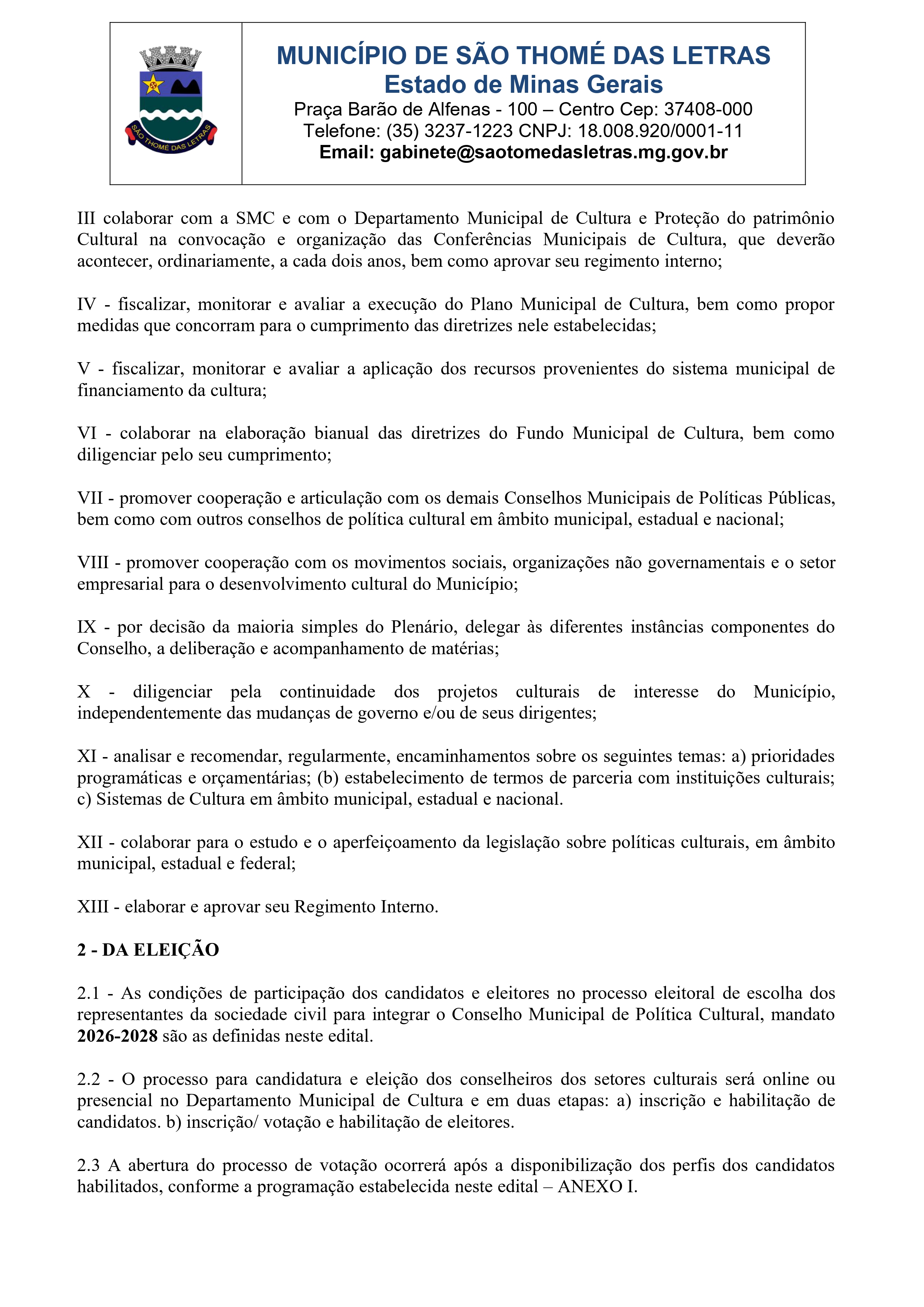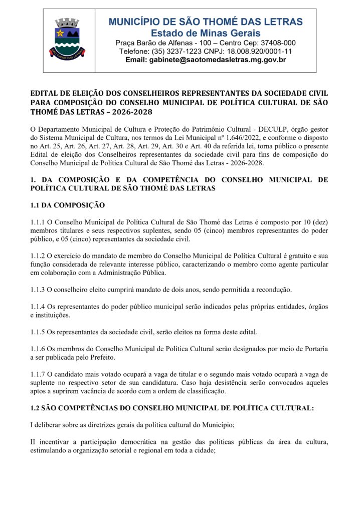 EDITAL 01 DE ELEIÇÃO DOS CONSELHEIROS REPRESENTANTES DA SOCIEDADE CIVIL PARA COMPOSIÇÃO DO CONSELHO MUNICIPAL DE POLÍTICA MUNICIPAL CULTURAL DE SÃO THOMÉ DAS LETRAS 2026-2028