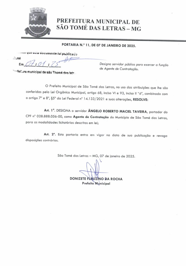 📄✍🏼Aos treze dias do mês de janeiro de 2025, o Prefeito Municipal de São Thomé das Letras, Estado de Minas Gerais, Donizete Flauzino Da Rocha, no uso de suas atribuições legais e em conformidade com a legislação em vigor, vem através deste Edital, CONVOCAR PARA A POSSE os seguintes candidatosaprovados e classificados no Concurso Público da Prefeitura Municipal de São Thomé das Letras (Editail nº 001/2023), para provimento dos cargos públicos e