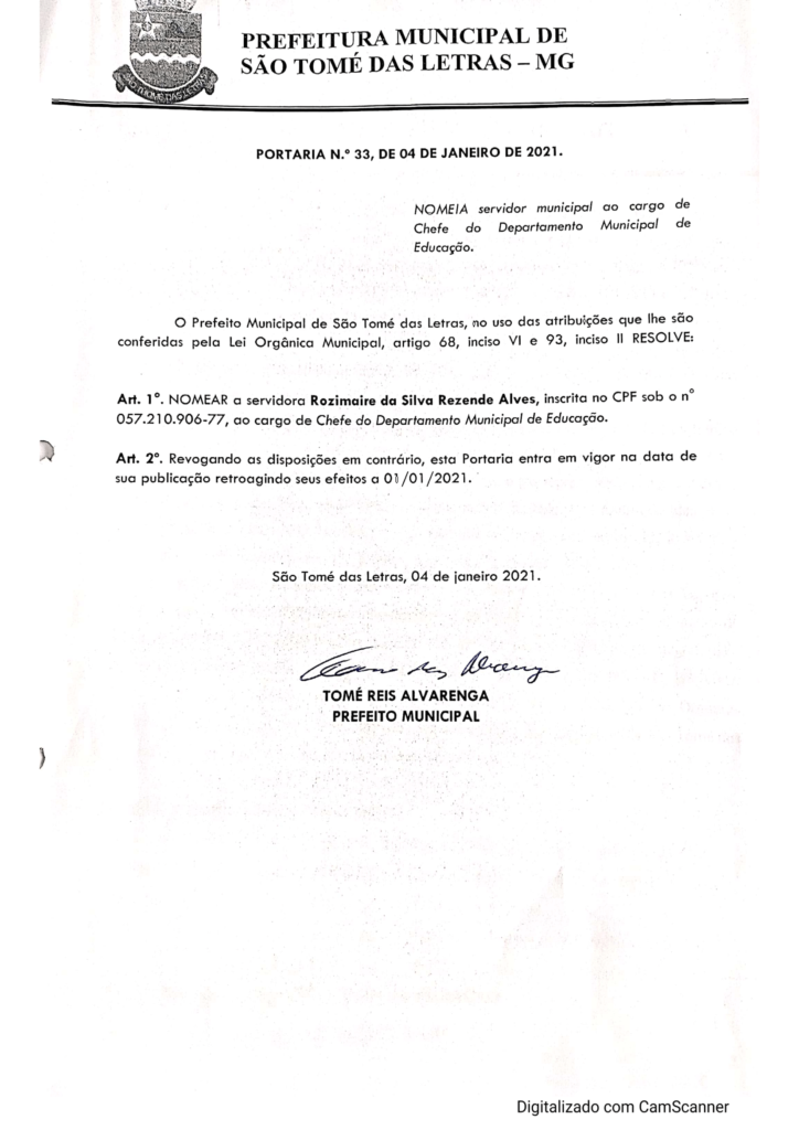 NOMEAÇÃO DA CHEFE DO DEPARTAMENTO MUNICIPAL DE EDUCAÇÃO DO MUNICÍPIO DE SÃO THOMÉ DAS LETRAS
