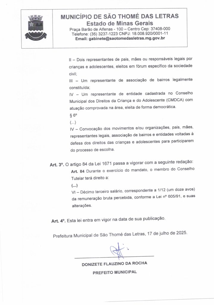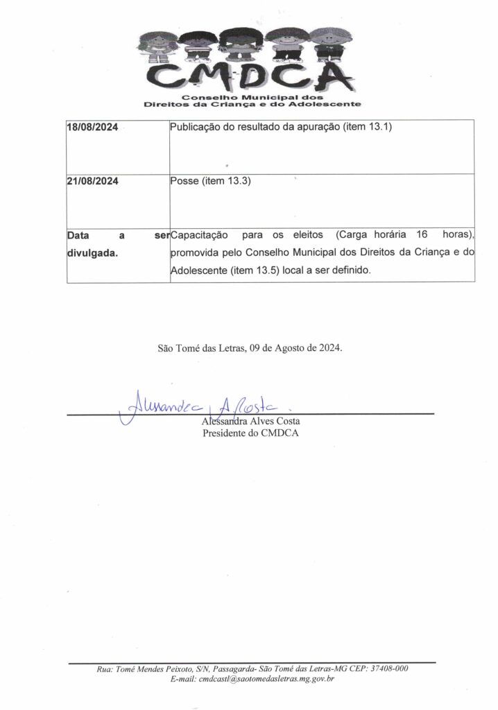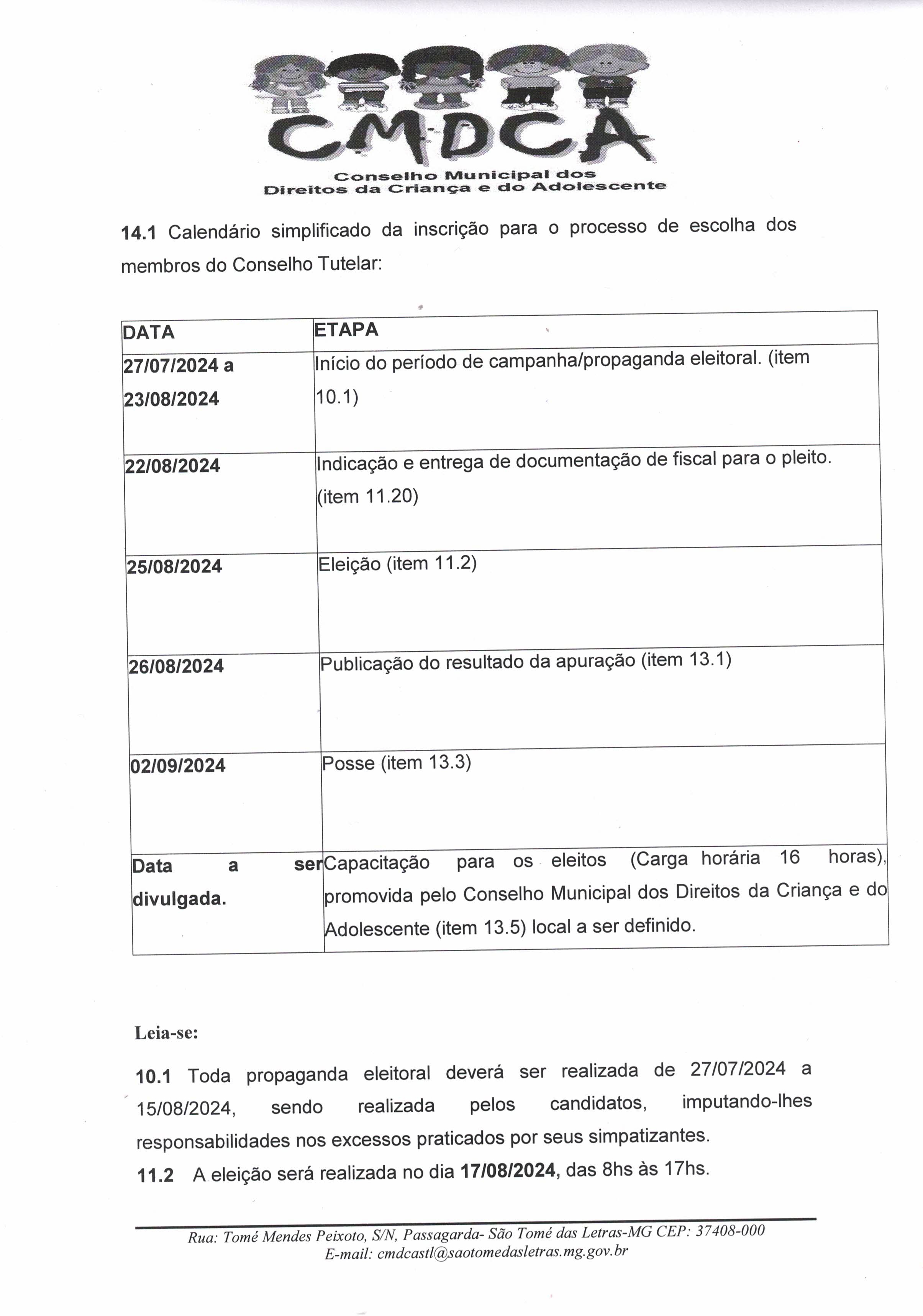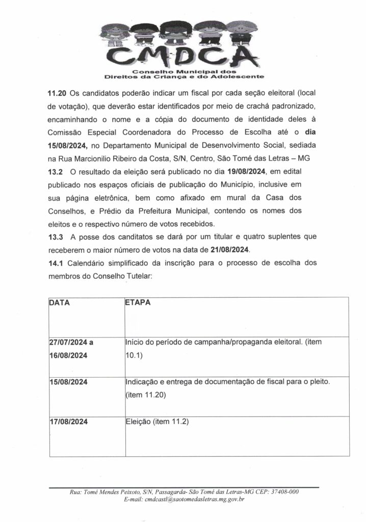 RETIFICAÇÃO N4 DO EDITAL 01 DE 19/06/2024 DO PROCESSO DE ELEIÇÃO COMPLEMENTAR DO CONSELHO TUTELAR DE SÃO THOMÉ DAS LETRAS