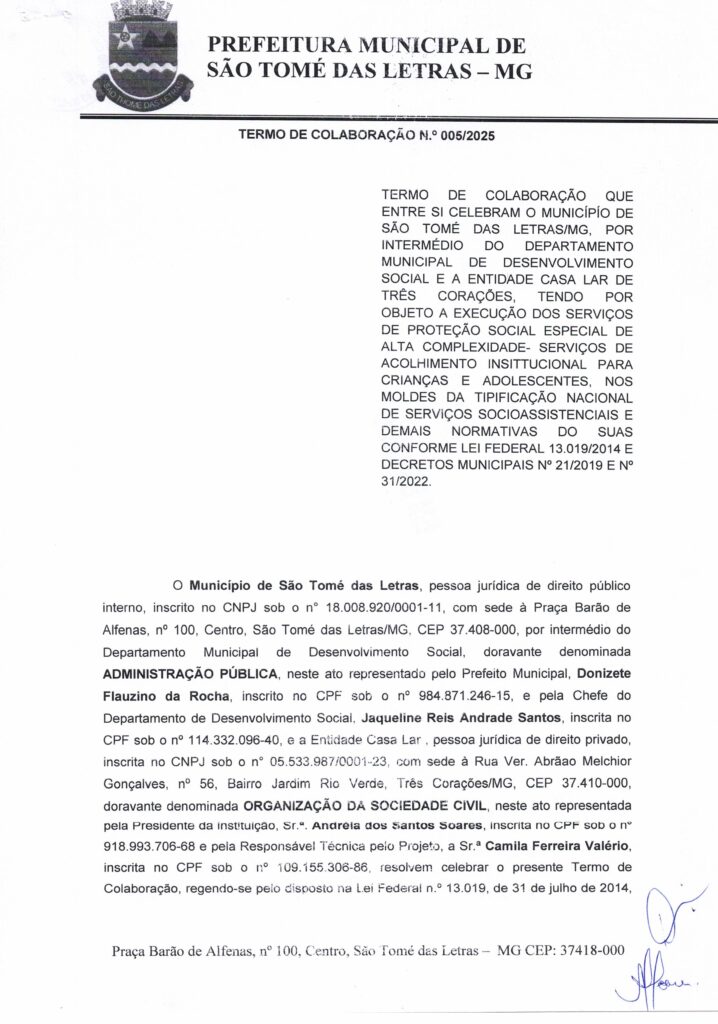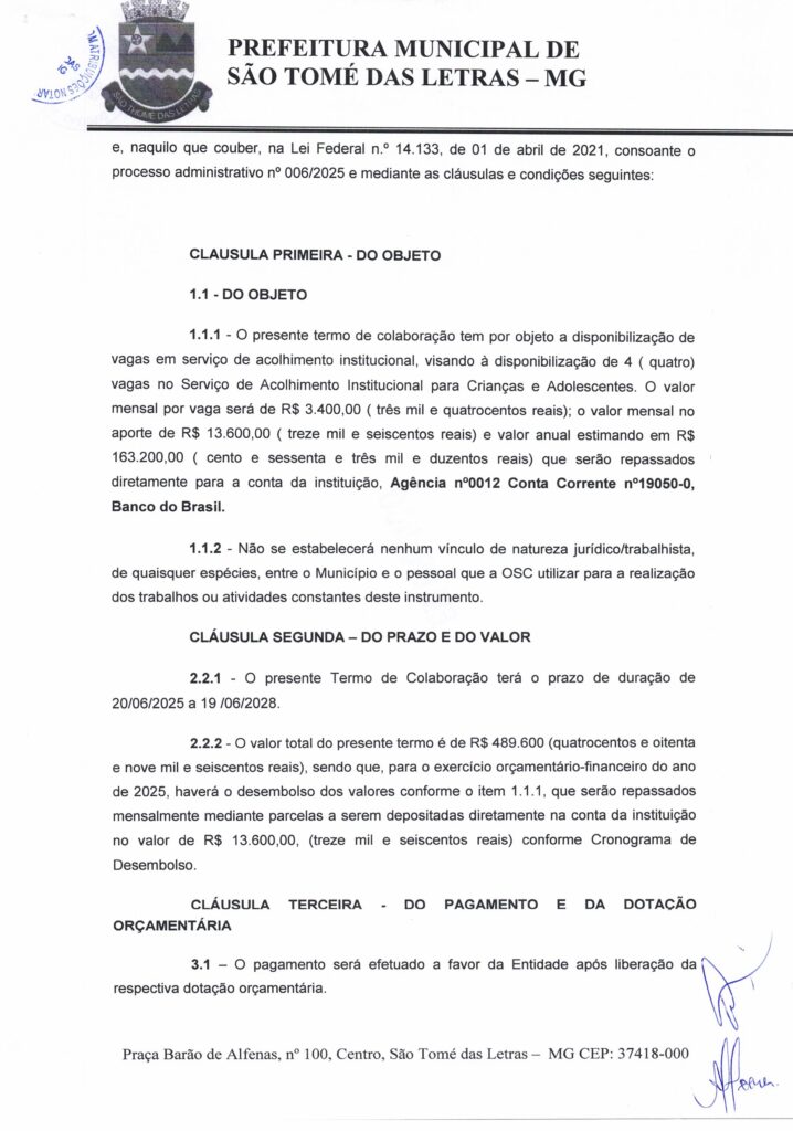 TERMO DE COLABORAÇÃO SOBRE EXECUÇÃO DOS SERVIÇOS DE PROTEÇÃO SOCIAL DE ALTA COMPLEXIDADE – ACOLHIMENTO INSTITUCIONAL PARA CRIANÇAS E ADOLESCENTES NA CASA LAR DE TRÊS CORAÇÕES