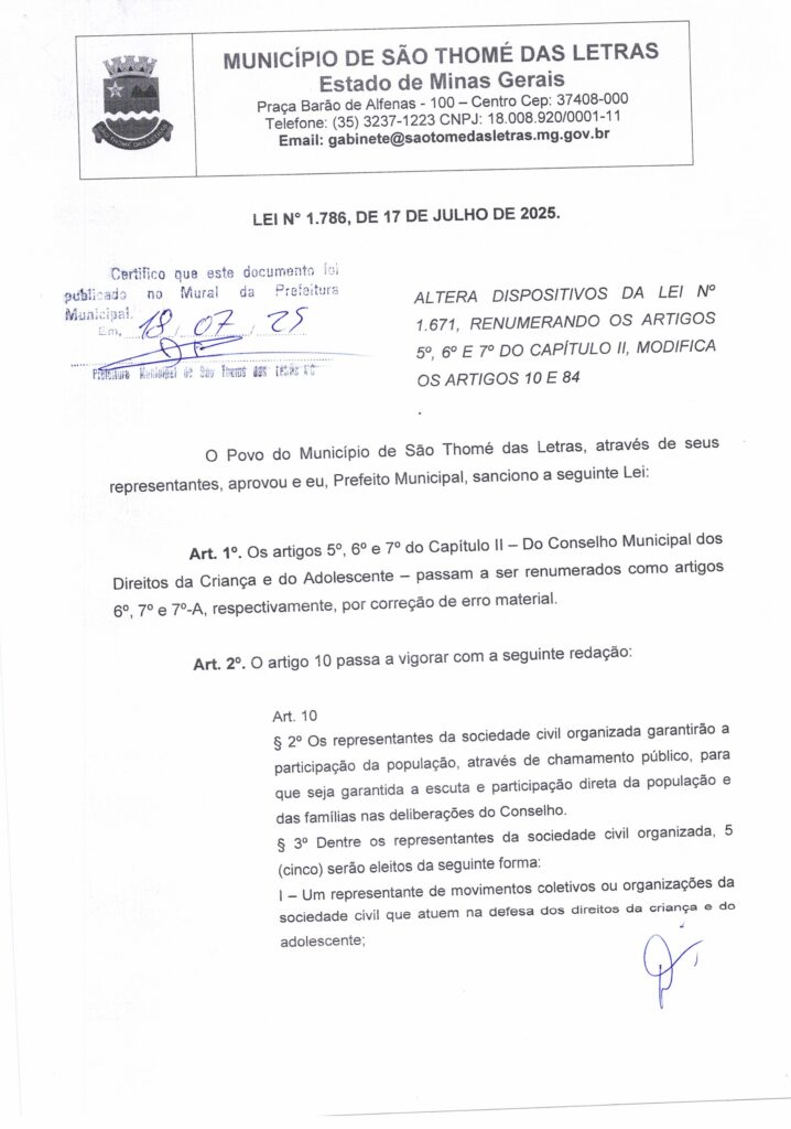 LEI 1.786 DE 2025 – ALTERA DISPOSITIVOS DA LEI 1.671/2023 PROMOVENDO ADEQUAÇÕES NA COMPOSIÇÃO DO CMDCA E NA ORGANIZAÇÃO DO CONSELHO TUTELAR
