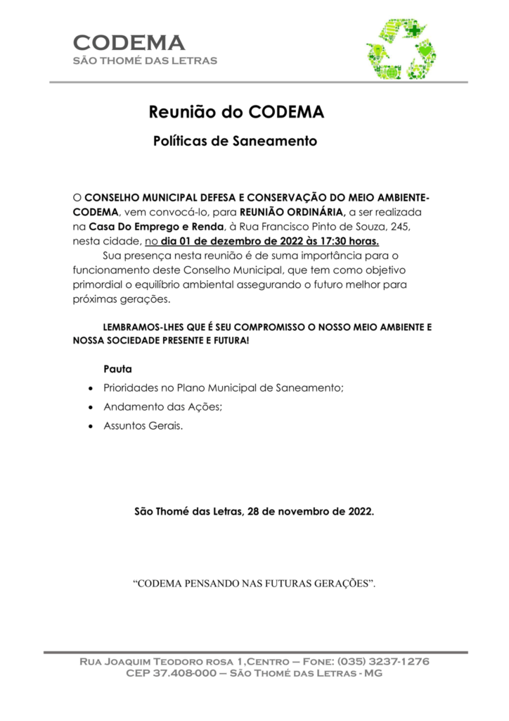 REUNIÃO DO CODEMA ACONTECE NESTA QUINTA-FEIRA 01/12/2022 ÀS 17H30 NA CASA DE EMPREGO E RENDA (AO LADO DA BIBLIOTECA EUBIOSE)
