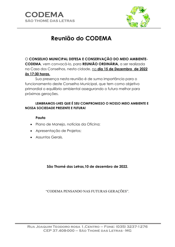 REUNIÃO DO CODEMA ACONTECE 15/12/2022 QUINTA-FEIRA NA SALA DOS CONSELHOS (CAMARIM DO CENTRO DE EVENTOS)