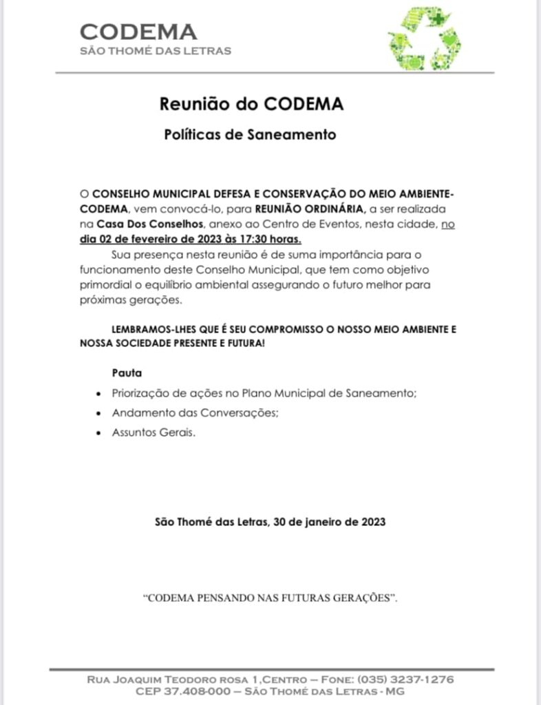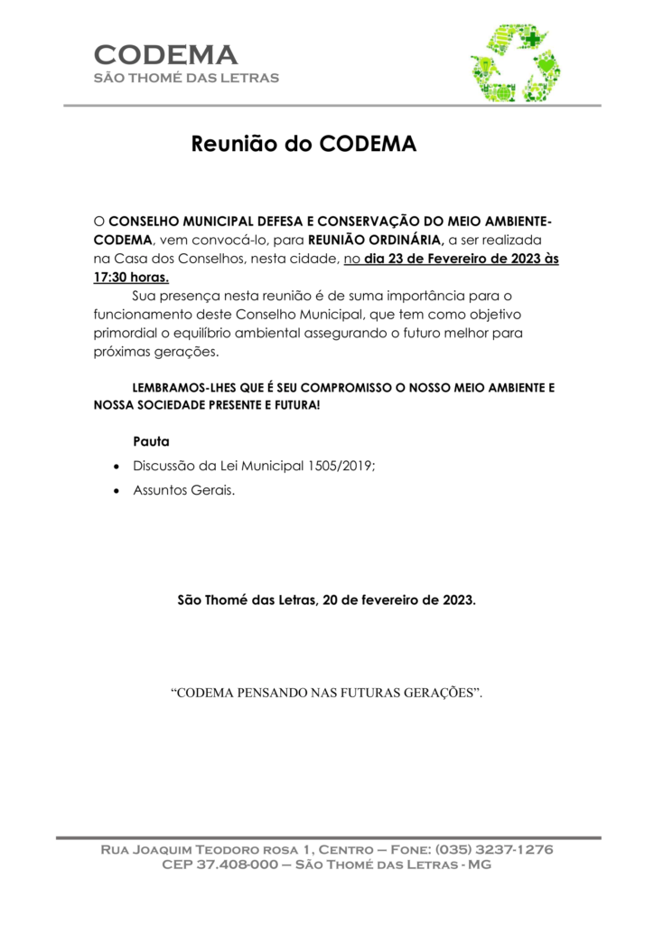 REUNIÃO DO CODEMA ACONTECE NESTA QUINTA-FEIRA 02/02/2023 ÀS 17H30 NA CASA DOS CONSELHOS (CAMARIM DO CENTRO DE EVENTOS)