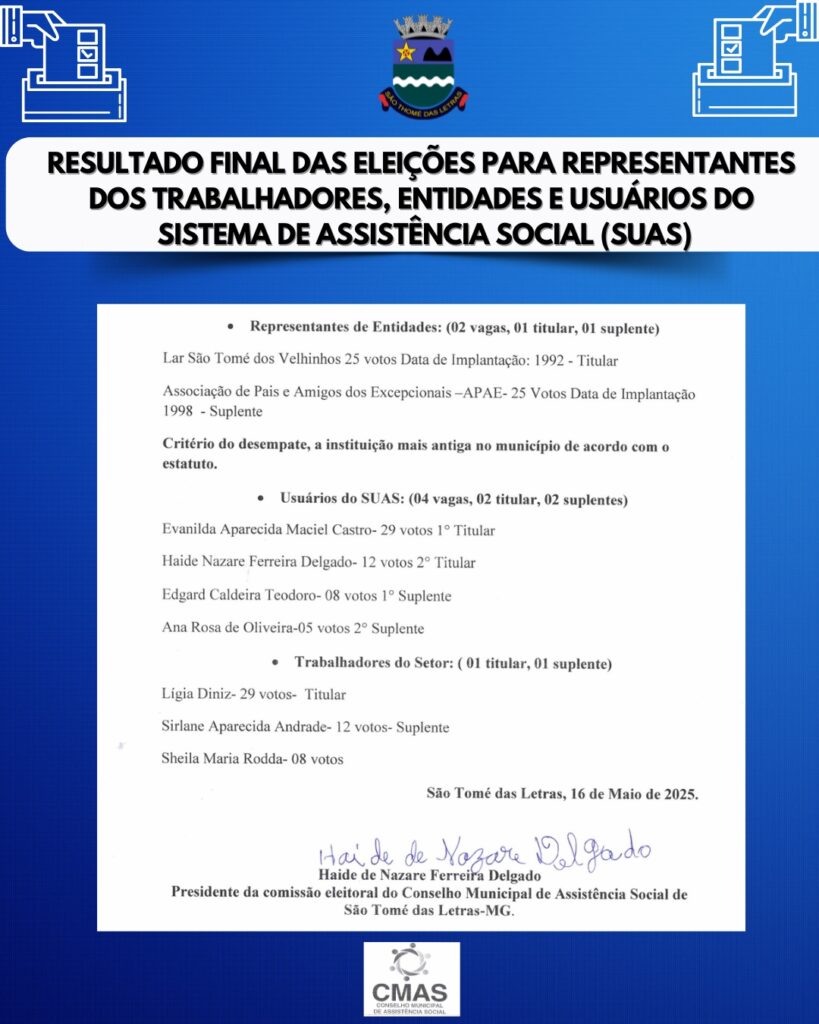 Resultado final das eleições para representantes dos trabalhadores, entidades e usuários do Sistema de Assistência Social SUAS REGISTROS POR VÍDEOS DA APURAÇÃo: https://drive.google.com/drive/folders/1N11RN_Ljcr-PbQtb8jRg_F3Fpix9y_7o?usp=sharing