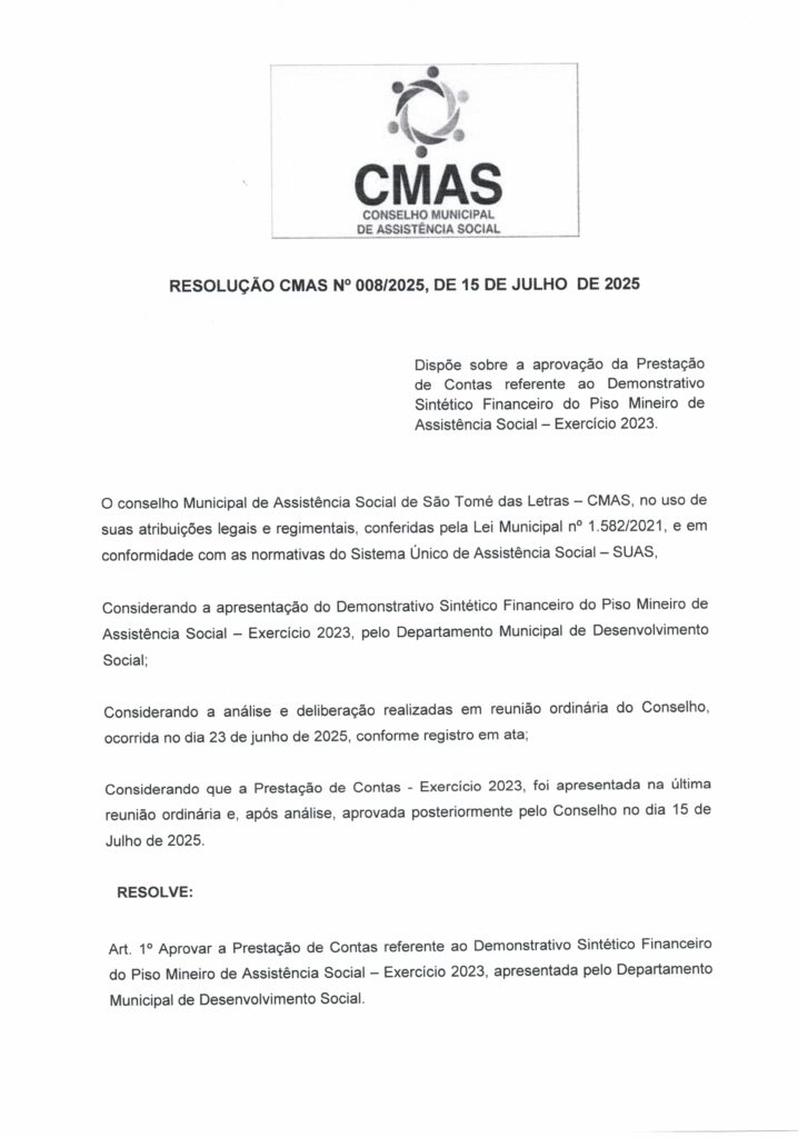 RESOLUÇÃO CMAS N° 008/2025, DE 15 DE JULHO DE 20 DISPÕE SOBRE APROVAÇÃO DE CONTAS REFERENTE AO DEMONSTRATIVO SINTÉTICO FINANCEIRO DO PISO MINEIRO DE ASSISTÊNCIA SOCIAL