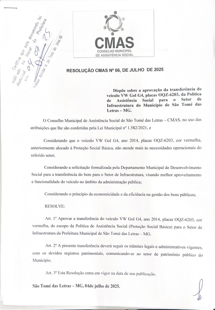 RESOLUÇÃO 006/2025 DISPÕE SOBRE A APROVAÇÃO DA TRANSFERÊNCIA DO VEÍCULO VW GOL G4, PLACA OQZ-6203 DA POLÍTICA DE ASSISTÊNCIA SOCIAL PARA O SETOR DE INFRAESTRUTURA DO MUNICÍPIO DE SÃO THOMÉ DAS LETRAS