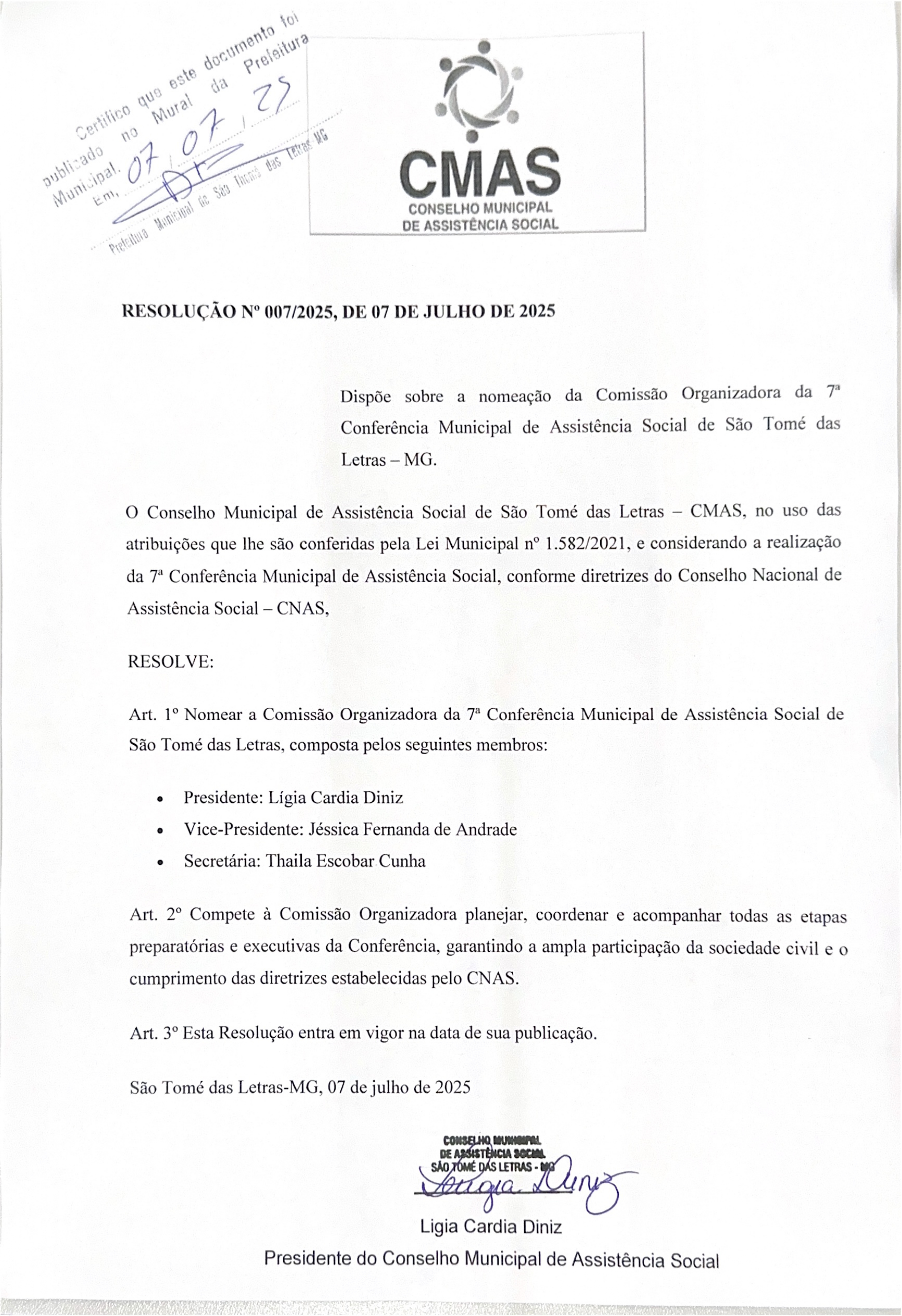 RESOLUÇÃO 007/2025 – DISPÕE SOBRE A NOMEAÇÃO DA COMISSÃO ORGANIZADORA DA SÉTIMA CONFERÊNCIA MUNICIPAL DE ASSISTÊNCIA SOCIAL