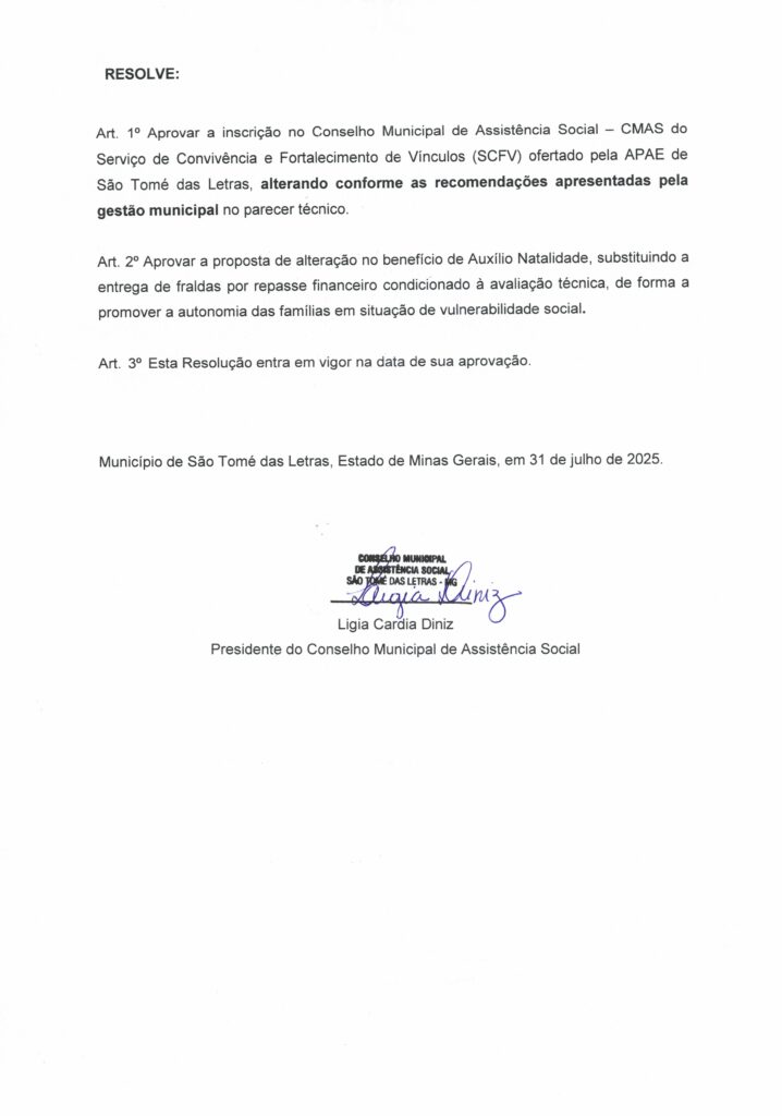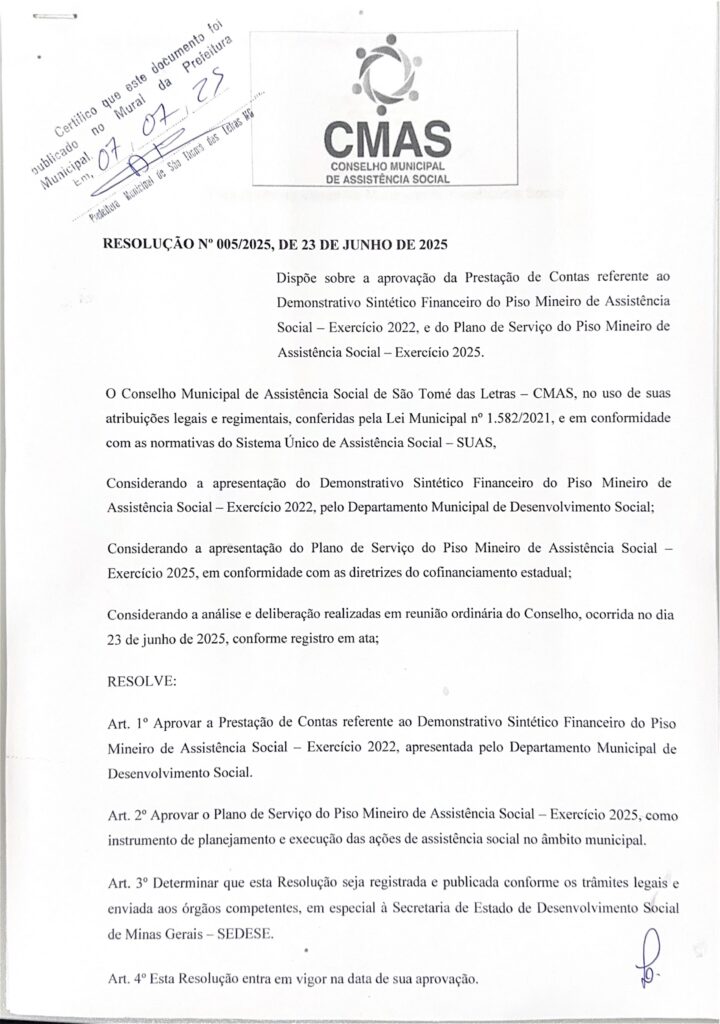 RESOLUÇÃO CMAS 05/2025 – DISPÕE SOBRE A APROVAÇÃO DA PRESTAÇÃO DE CONTAS REFERENTE AO DEMONSTRATIVO SINTÉTICO FINANCEIRO DO PISO MINEIRO DE ASSISTÊNCIA SOCIAL – EXERCÍCIO 2022, E DO PLANO DE SERVIÇO DO PISO MINEIRO DE ASSITÊNCIA SOCIAL EXERCÍCIO 2025