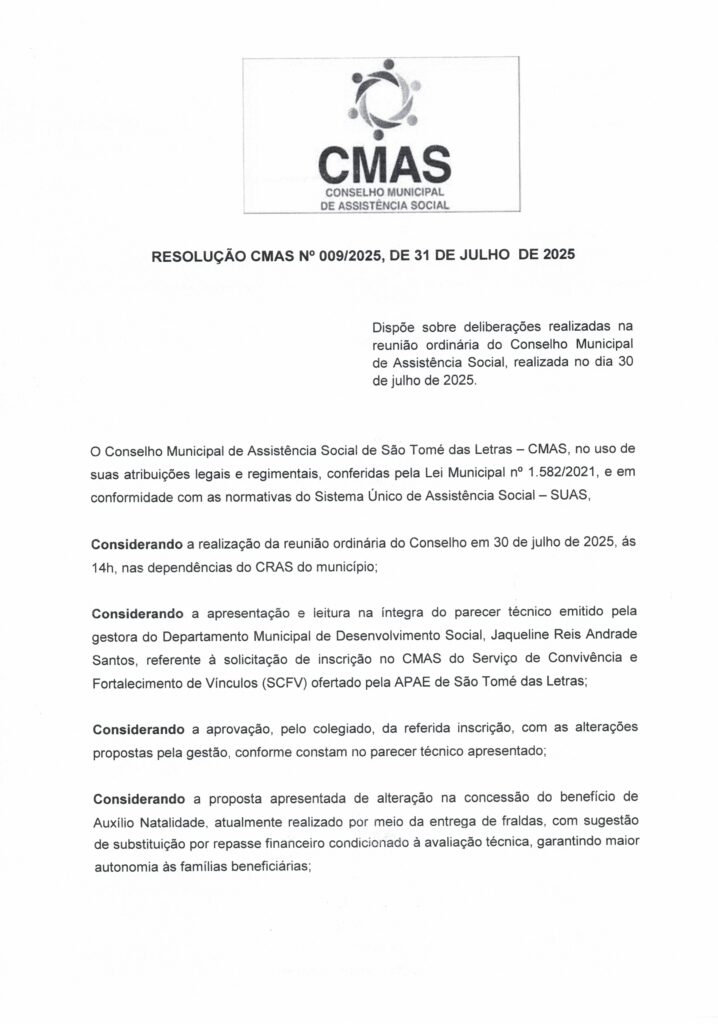 RESOLUÇÃO 09/2025 DISPÕE SOBRE DELIBERAÇÕES REALIZADAS NA REUNIÃO ORDINÁRIA DO CONSELHO MUNICIPAL DE ASSISTÊNCIA SOCIAL DE 30/07/2025 CLIQUE AQUI PARA ACESSAR EM PDFBaixar