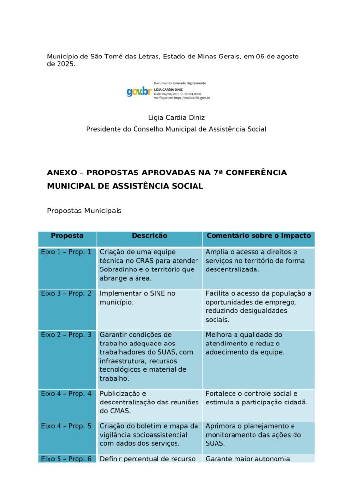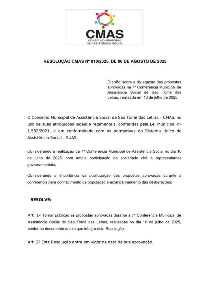 RESOLUÇÃO 10 DE 2025 – CMAS- DISPÕE SOBRE A DIVULGAÇÃO DAS PROPOSTAS APROVADAS NA SÉTIMA CONFERÊNCIA MUNICIPAL DE ASSISTÊNCIA SOCIAL REALIZADA DIA 10/07/2025