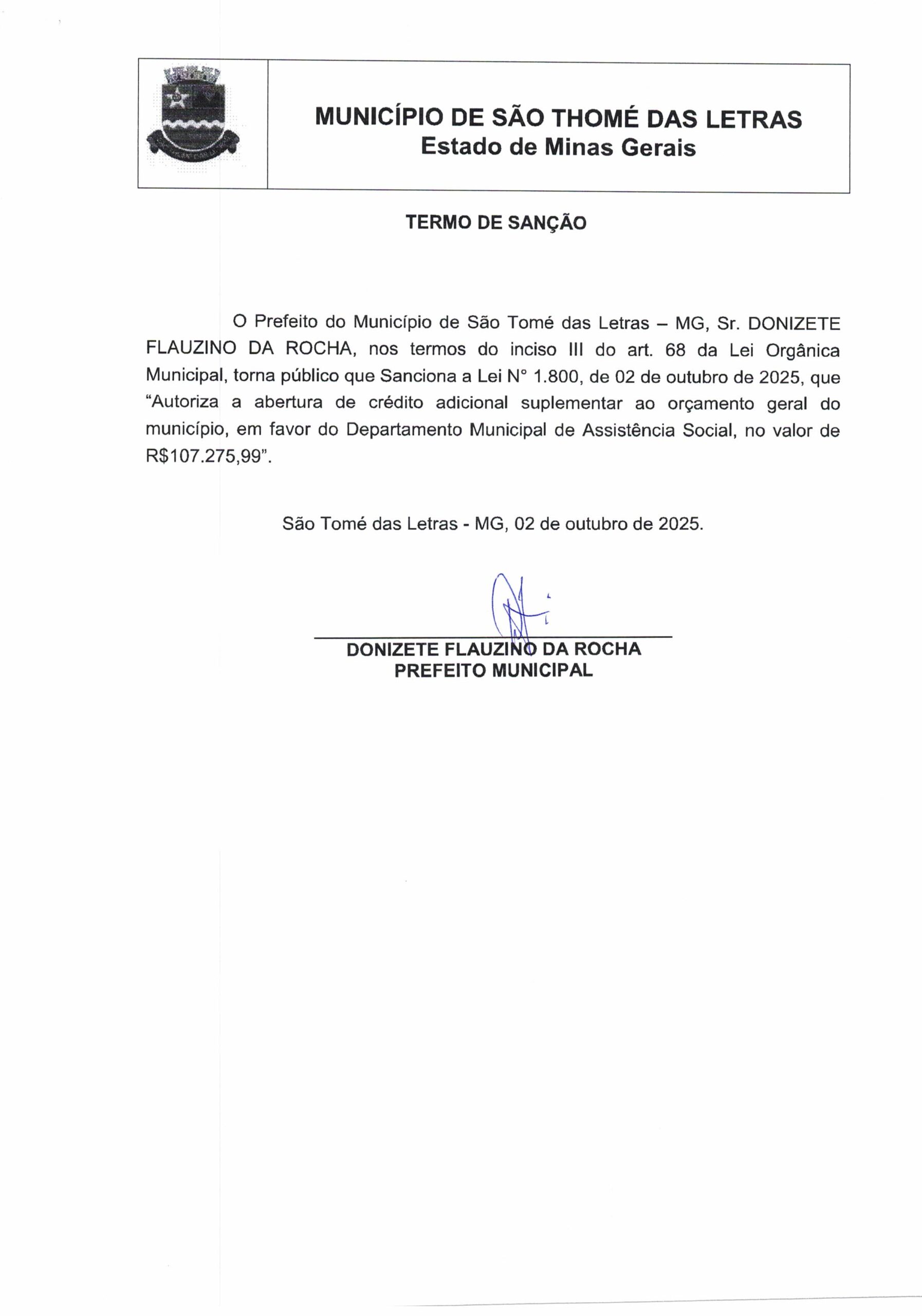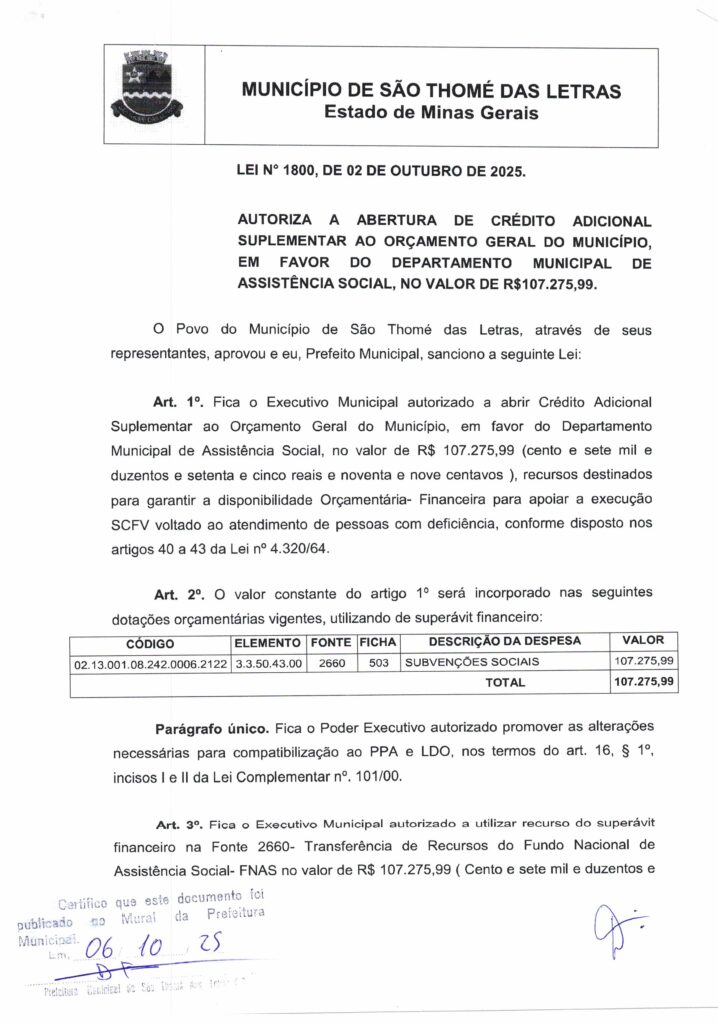 LEI 1.800 DE 2025 AUTORIZA A ABERTURA DE CRÉDIO ADICIONAL SUPLEMENTAR AO ORÇAMENTO GERAL DO MUNICÍPIO EM FAVOR DO DEPARTAMENTO MUNICIPAL DE ASSISTÊNCIA SOCIAL NO VALOR DE R$ 107.275,99