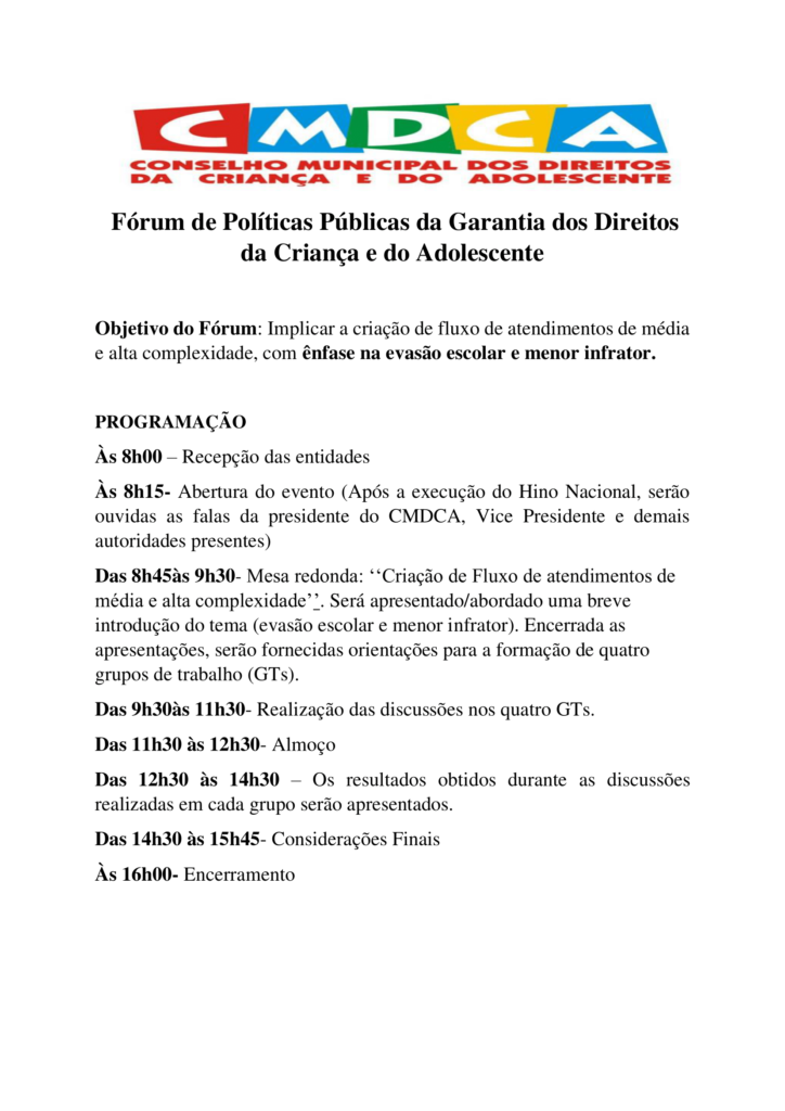 I fórum de políticas públicas de garantia dos direitos das crianças e adolescentes de São Thomé das Letras;( primeiro tema articular com a rede os casos de evasão escolar e fluxo de atendimentos de média e alta complexidade.