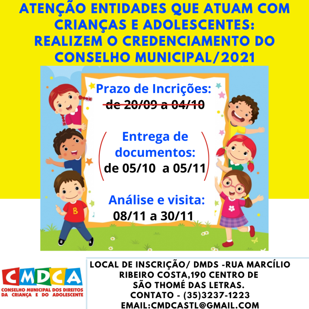 📄📌📣#CMDCA – ÚLTIMOS DIAS PARA ENTREGA DA DOCUMENTAÇÃO – Os interessados têm até o dia 05 de novembro pra se credenciar junto ao Conselho Municipal dos Direitos da Criança e do Adolescente (CMDCA). Este prazo e outras informações sobre o registro de entidades, inscrições de programas, projetos e serviços de atendimento, fazem parte da resolução normativa 001/2021, lançada pelo conselho.