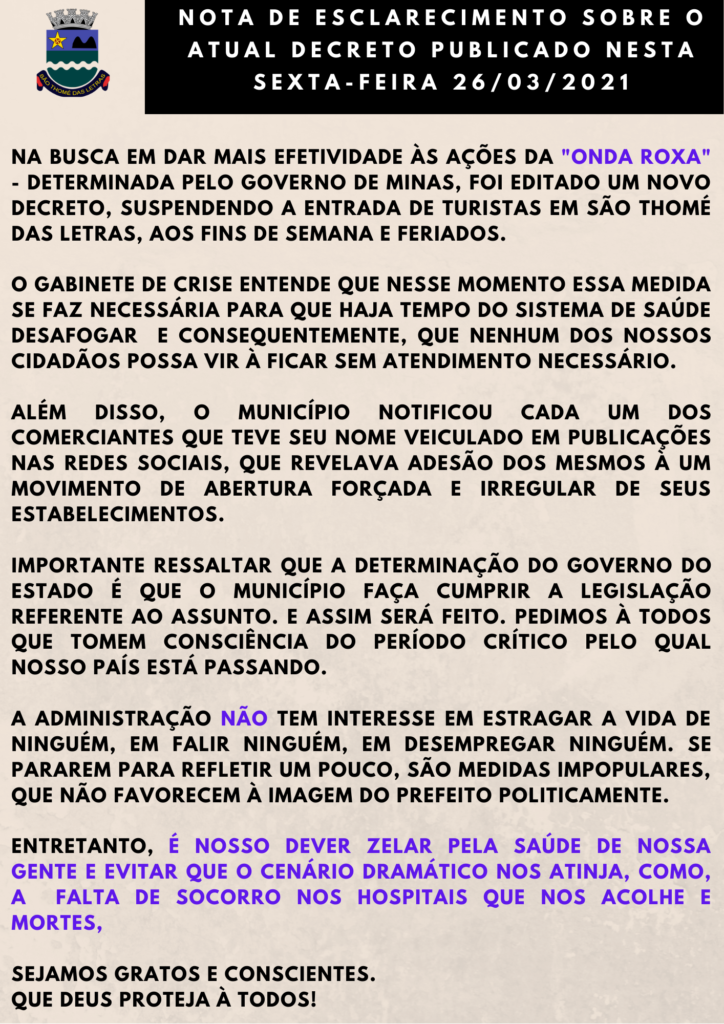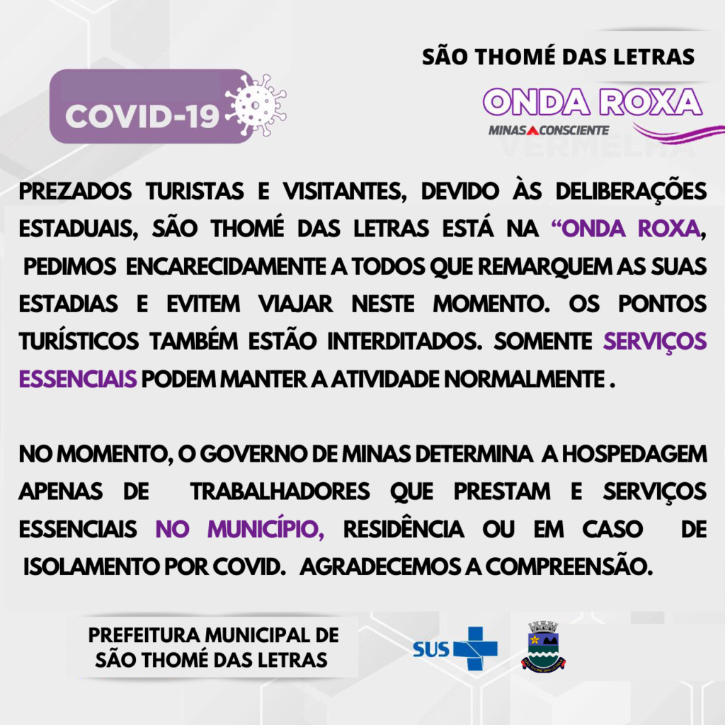 São Thomé das Letras e todas os demais 852 municípios da macrorregiões de Minas Gerais permanecerão na onda roxa até o fim da Semana Santa, no dia 4 de abril. A determinação do Estado de Minas, tem como objetivo evitar o colapso do sistema de Saúde e garantir que não falte assistência médica a nenhum mineiro.