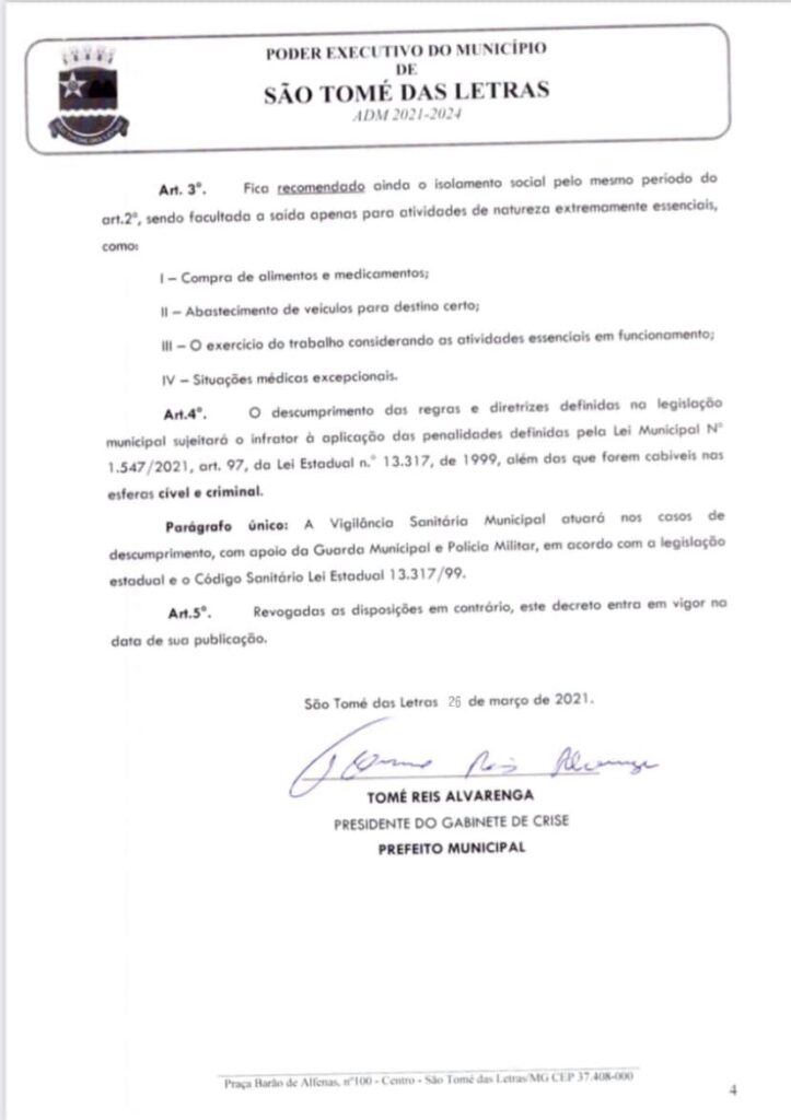 𝗔𝗿𝘁.𝟱°. Revogadas as disposições em contrário, este decreto entra em vigor na data de sua publicação. São Tomé das Letras 26, de março de 2021.