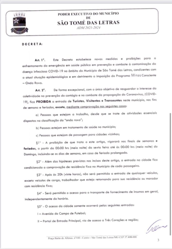 𝗔𝗿𝘁. 𝟭°. Este Decreto estabelece novas medidas e proibições para o enfrentamento da emergência em saúde pública em prevenção e combate à contaminação da doença infecciosa COVID-19 no âmbito do Município de São Tomé das Letras, condizentes com a atual situação epidemiológica e em detrimento a imposição do Programa Minas Consciente – Onda Roxa.
