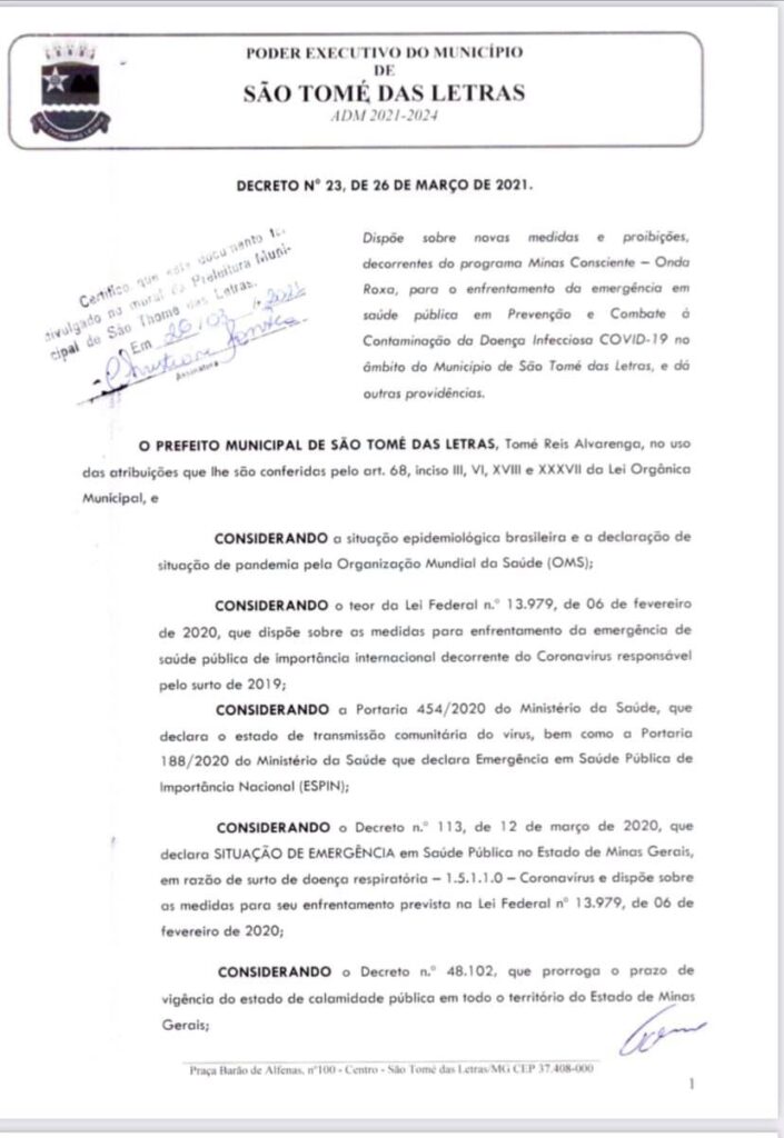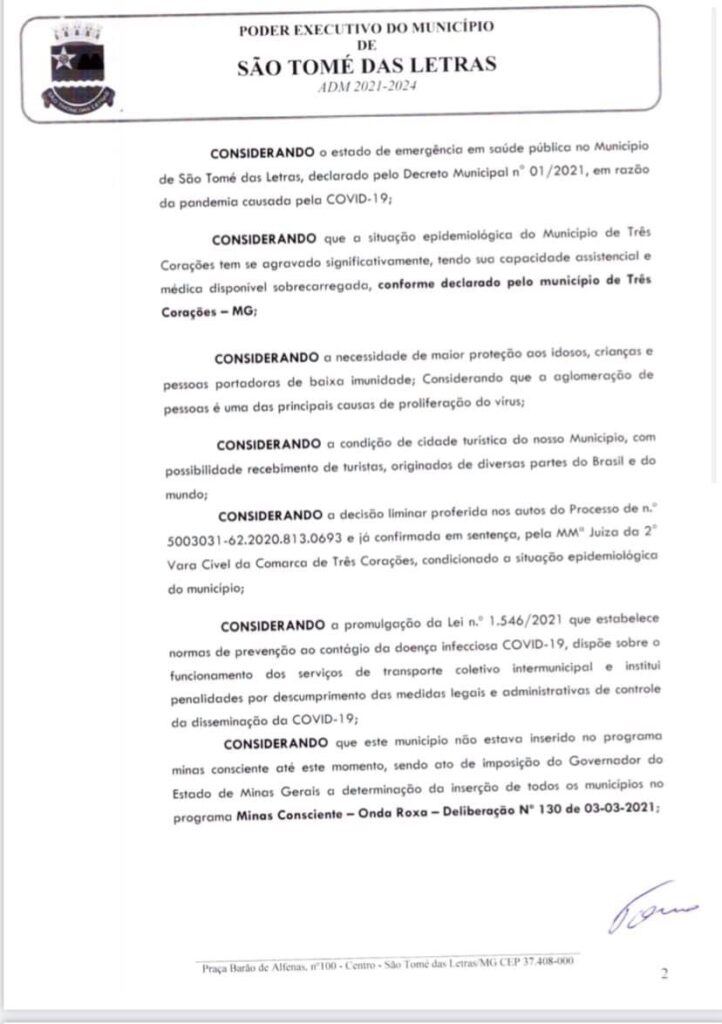 𝗖𝗢𝗡𝗦𝗜𝗗𝗘𝗥𝗔𝗡𝗗𝗢 o estado de emergência em saúde pública no Município de São Tomé das Letras, declarado pelo Decreto Municipal n° 01/2021, em razão da pandemia causada pela COVID-19;