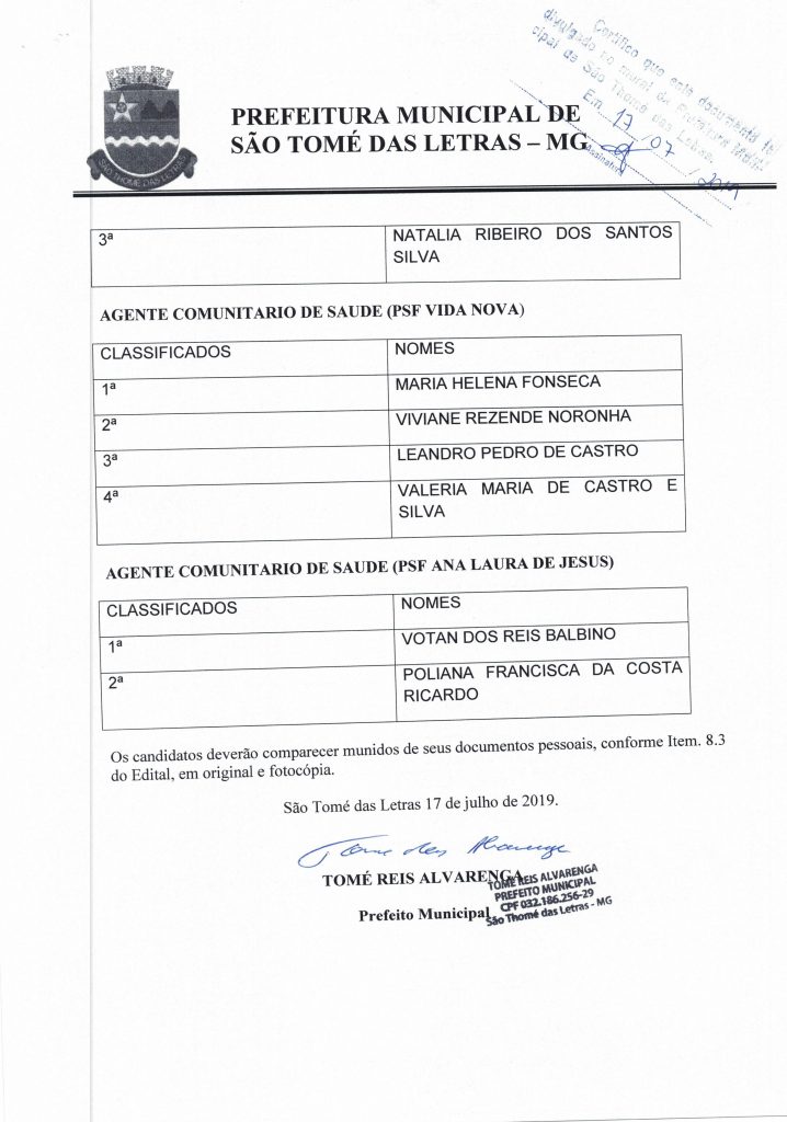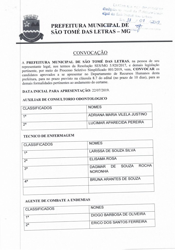A Prefeitura Municipal de São Tomé das Letras, Convoca os candidatos aprovados a se apresentar no Departamento de Recurso Humanos no prazo previsto na cláusula 8.7 do edital ( no prazo de 10 dias), para as demais formalidades pertinentes ao andamento certame. DATA INICIAL PARA APRESENTAÇÃO : 22 /07 / 2019