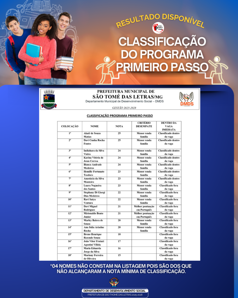 👏#Resultado disponível! Os estudantes que participaram da prova do Processo Seletivo do Programa Primeiro Passo já podem conferir a lista de classificados.