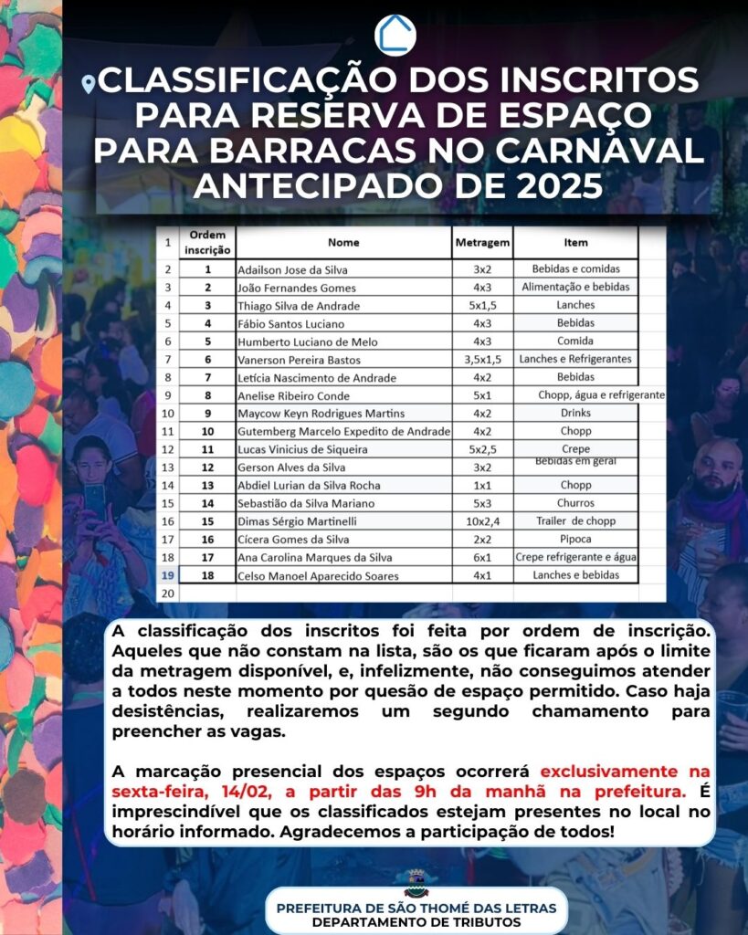 Classificação dos Inscritos para Reserva de Espaço para barracas no carnaval antecipado de 2025 Início / Notícia /