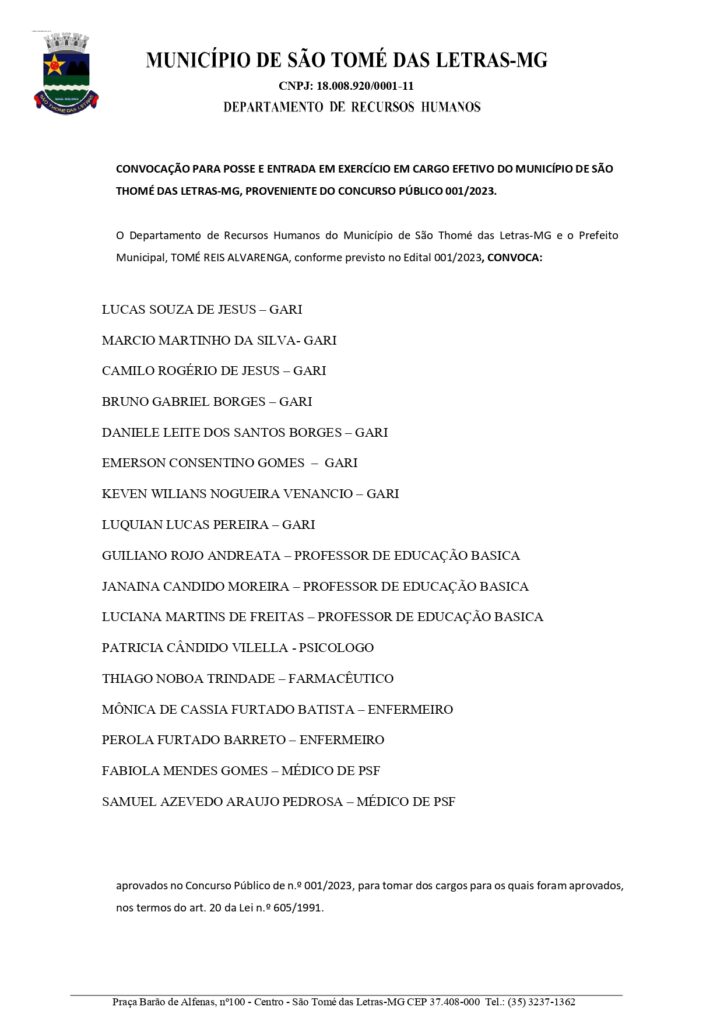 O Departamento de Recursos Humanos do Município de São Thomé das Letras-MG e o Prefeito Municipal, TOMÉ REIS ALVARENGA, conforme previsto no Edital 001/2023, CONVOCA 3ª REMESSA PARA POSSE EM CARGO EFETIVO DO MUNICÍPIO DE SÃO THOMÉ DAS LETRAS-MG, PROVENIENTE DO CONCURSO PÚBLICO 001/2023: