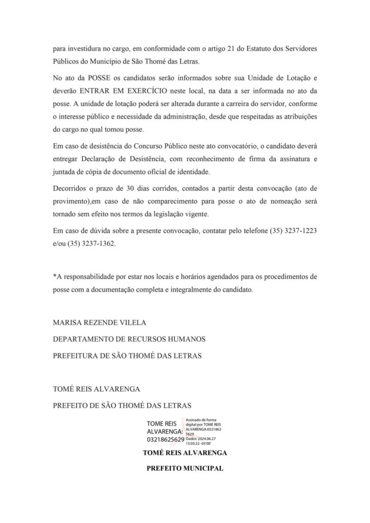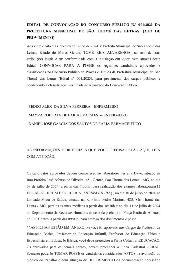 CONVOCAÇÃO DA 5ª REMESSA PARA POSSE EM CARGO EFETIVO DO MUNICÍPIO DE SÃO THOMÉ DAS LETRAS-MG, PROVENIENTE DO CONCURSO PÚBLICO 001/2023: Início / Notícia /