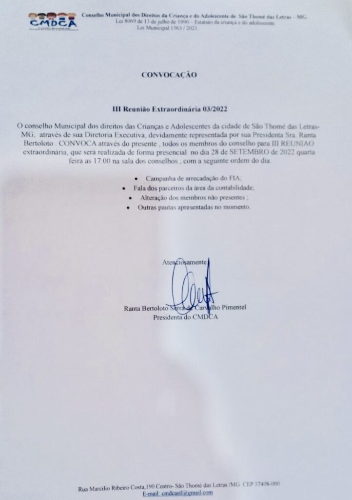 CONVOCAÇÃO PARA REUNIÃO EXTRAORDINÁRIA 03/2022 DO CONSELHO MUNICIPAL DOS DIREITOS DA CRIANÇA E DO ADOLESCENTE.