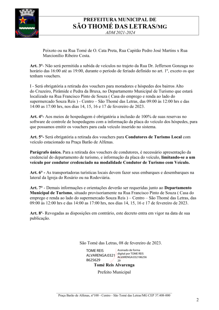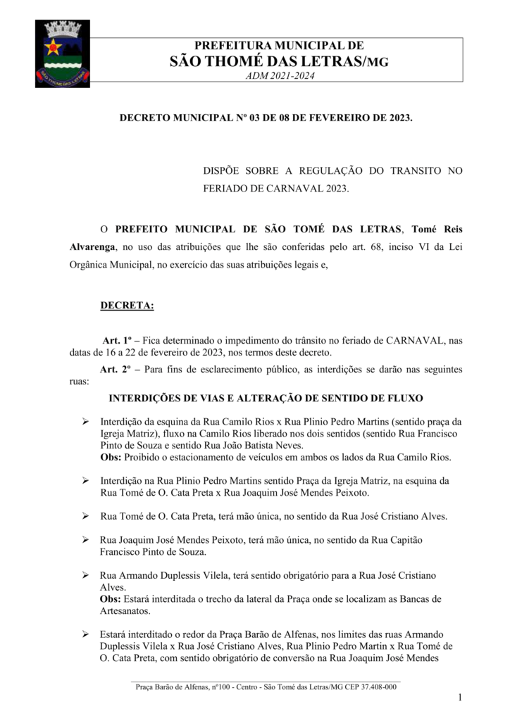 DECRETO 03 DO DIA 08 DE FEVEREIRO DE 2023 – DISPÕE SOBRE A REGULAÇÃO DO TRÂNSITO NO FERIADO DE CARNAVAL OFICIAL 2023 EM SÃO THOMÉ DAS LETRAS Início / Notícia /