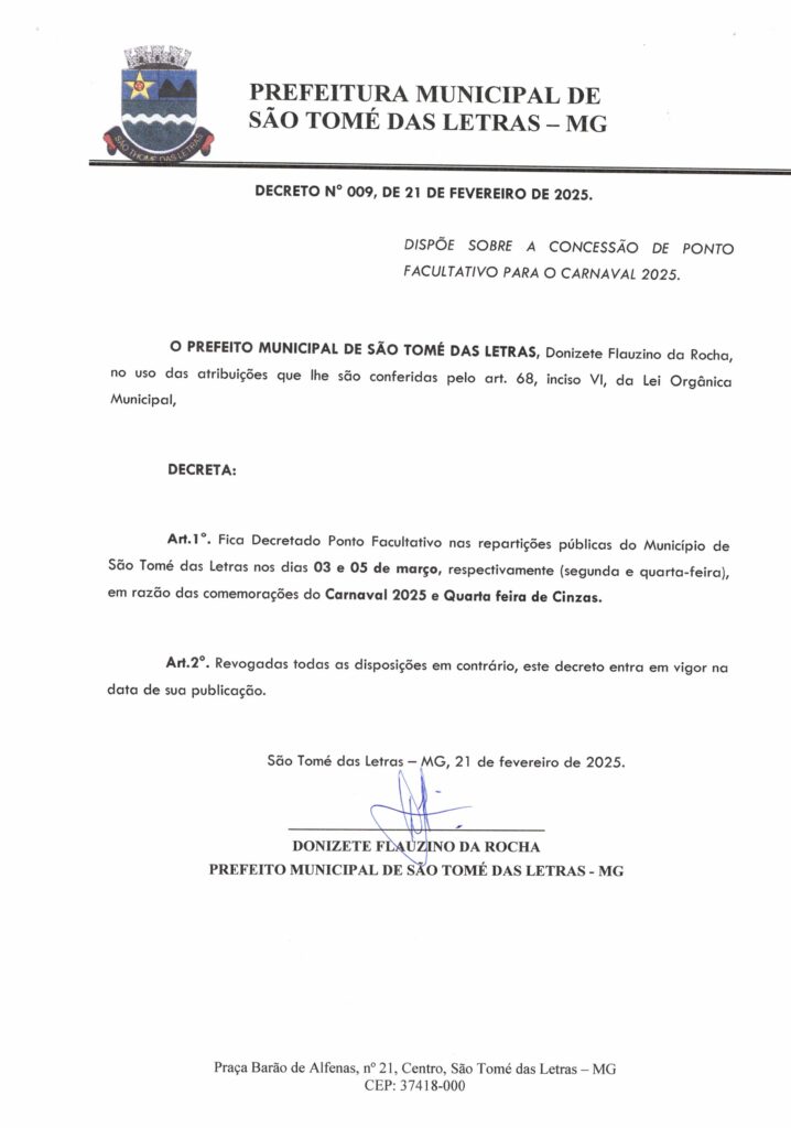DECRETO 09/2025 – DISPÕE SOBRE A CONCESSÃO DE PONTO FACULTATIVO PARA O CARNAVAL 2025 Início / Notícia /