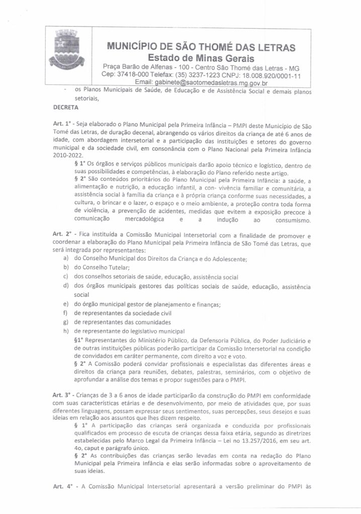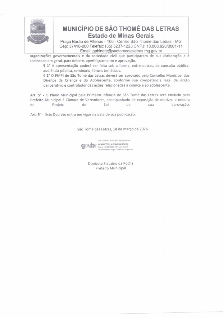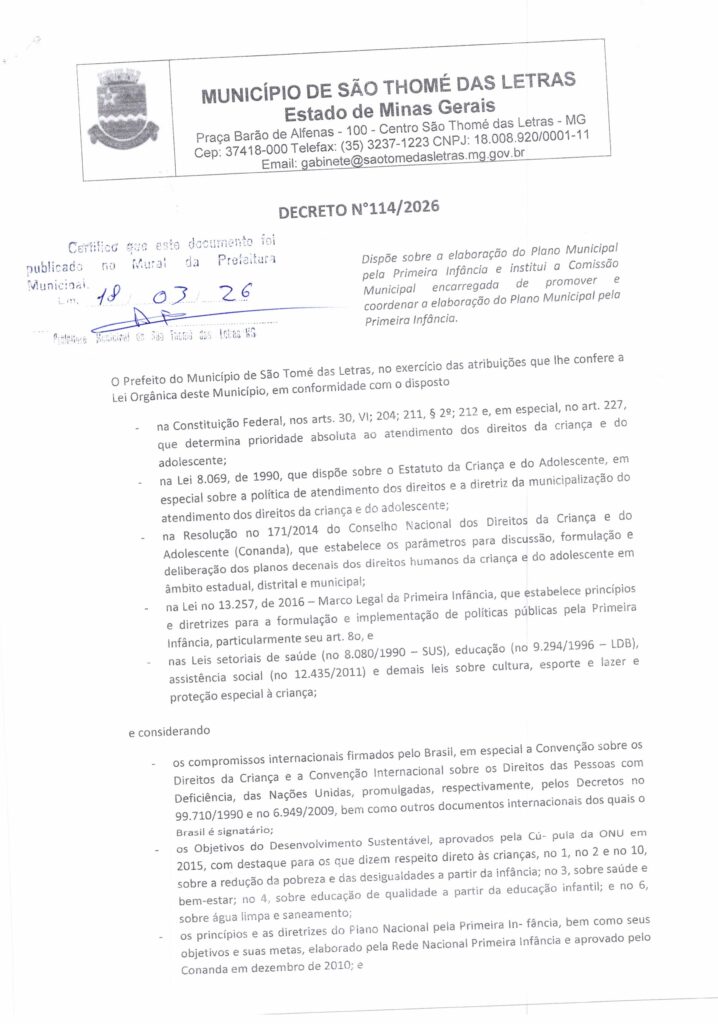 DECRETO 114/2026 – DISPÕE SOBRE ELABORAÇÃO DO PLANO MUNICIPAL PELA PRIMEIRA INFÂNCIA E INSTITUI A COMISSÃO MUNICIPAL ENCARREGADA DE PROMOVER E COORDENAR A ELABORAÇÃO DO PLANO MUNICIPAL PELA PRIMEIRA INFÂNCIA – Início / Notícia /