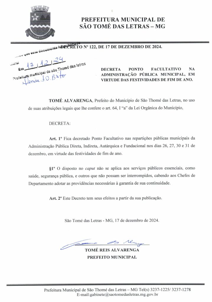 DECRETO 122 – DECRETA PONTO FACULTATIVO NA ADMINISTRAÇÃO PÚBLICA MUNICIPAL EM VIRTUDE DAS FESTIVIDADES DE FIM DE ANO Início / Notícia /