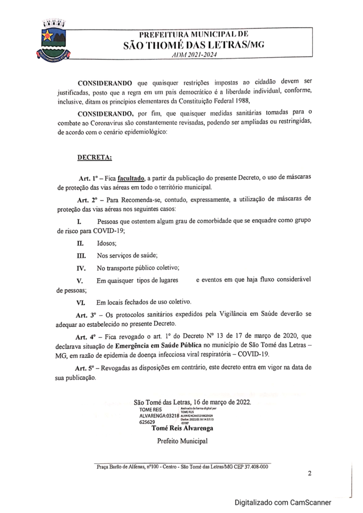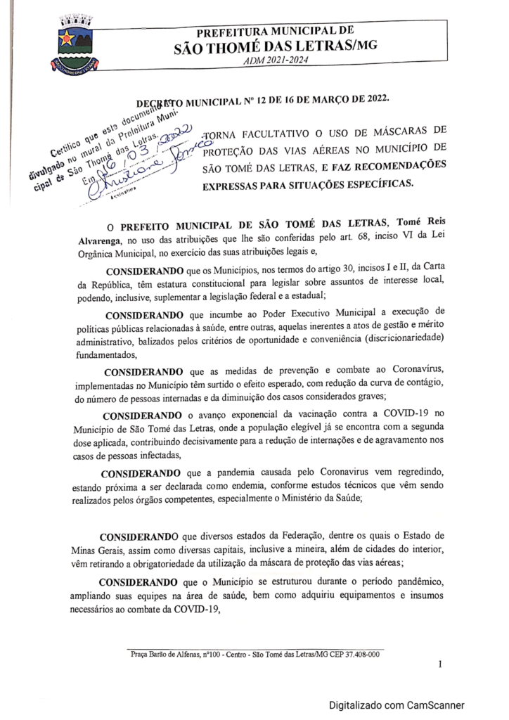 DECRETO Nº12 / TORNA O USO DE MÁSCARA OPCIONAL EM LOCAIS ABERTOS DO MUNICÍPIO DE SÃO THOMÉ DAS LETRAS