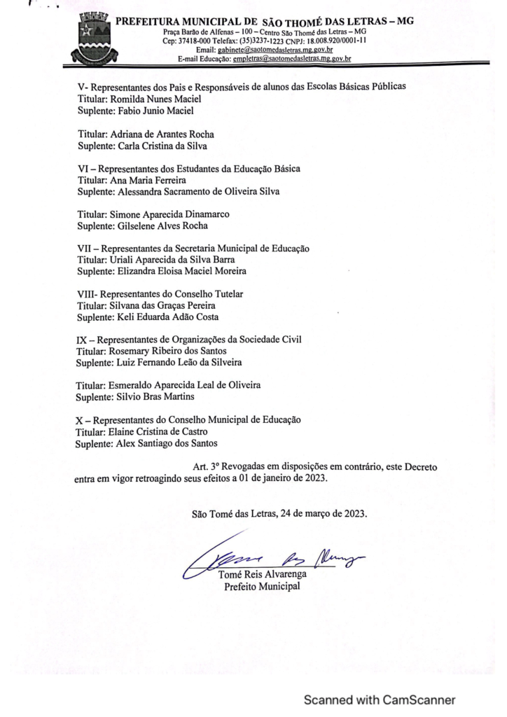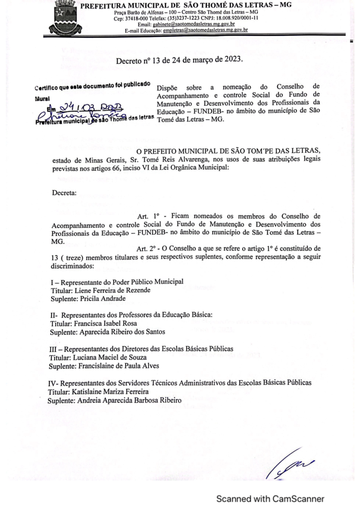 DECRETO 13/ DISPÕE SOBRE A NOMEAÇÃO DO CONSELHO DE ACOMPANHAMENTO E CONTROLE SOCIAL DO FUNDO DE MANUTENÇÃO E DESENVOLVIMENTO DOS PROFISSIONAIS DA EDUCAÇÃO-FUNDEB NO ÂMBITO DE SÃO THOMÉ DAS LETRAS Início / Notícia / ACESSE OU BAIXE O DECRETO 13/2023Baixar