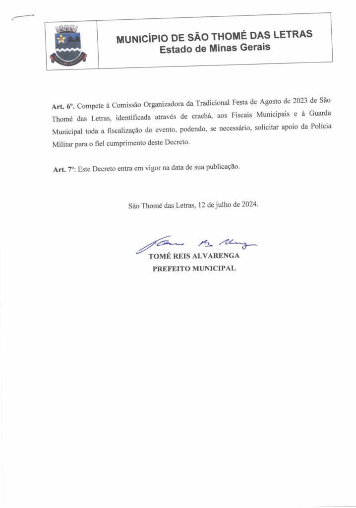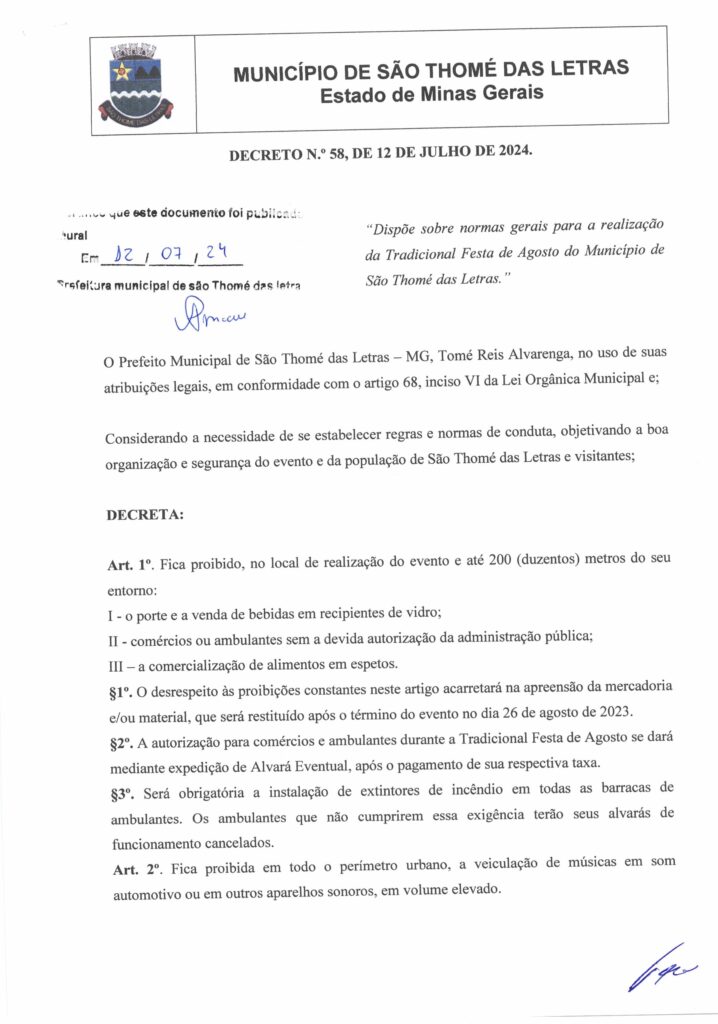 DECRETO 58 – DISPÕE SOBRE AS NORMAS GERAIS PARA REALIZAÇÃO DA TRADICIONAL FESTA DE AGOSTO DE SÃO THOMÉ DAS LETRAS 2024 Início / Notícia /